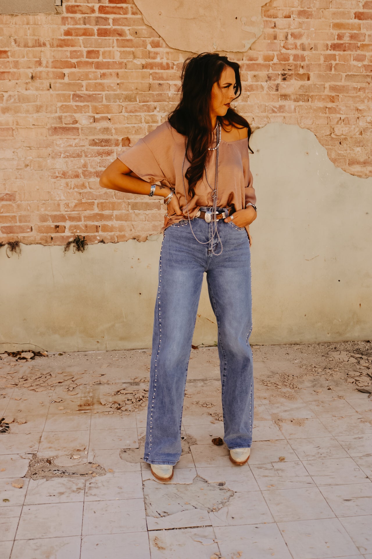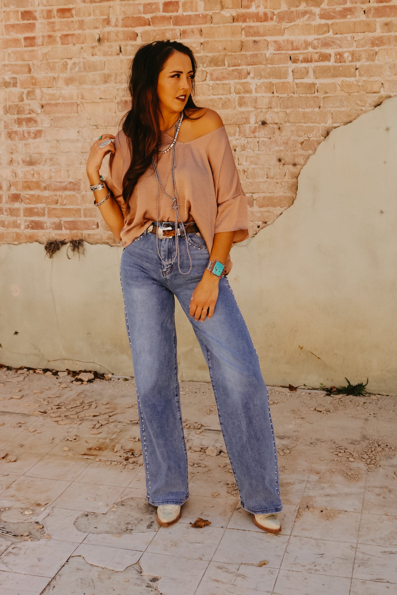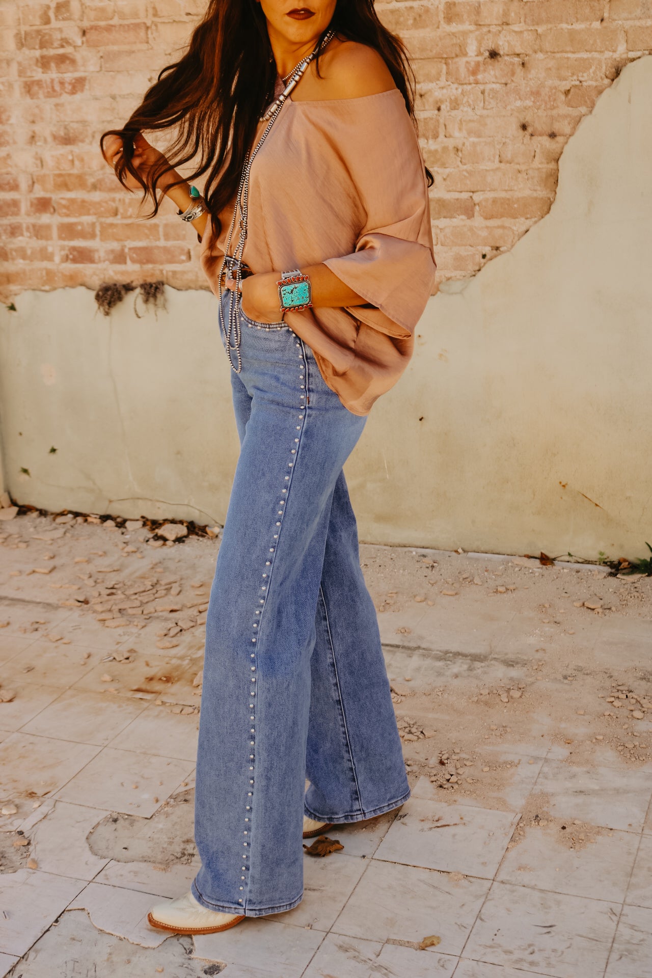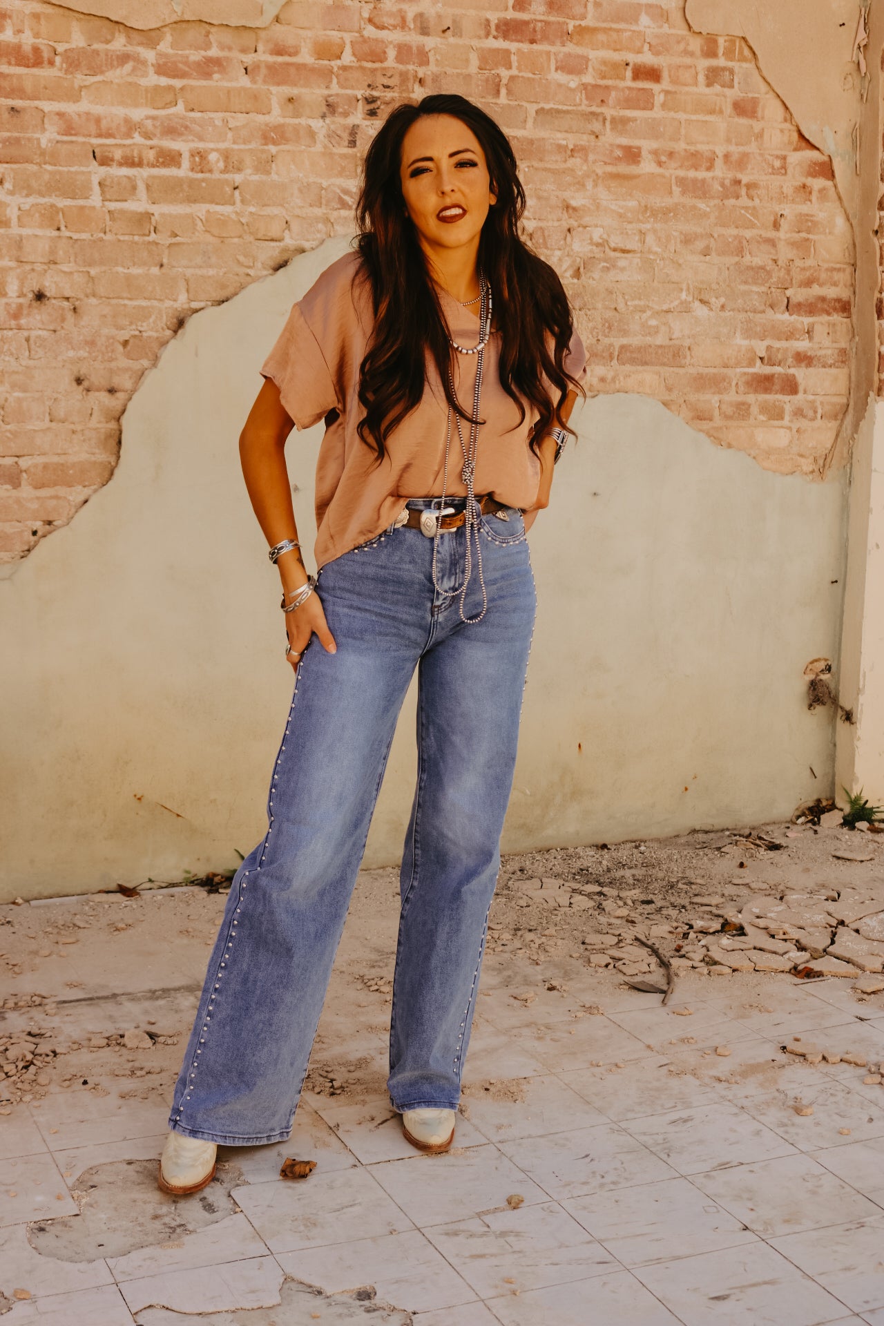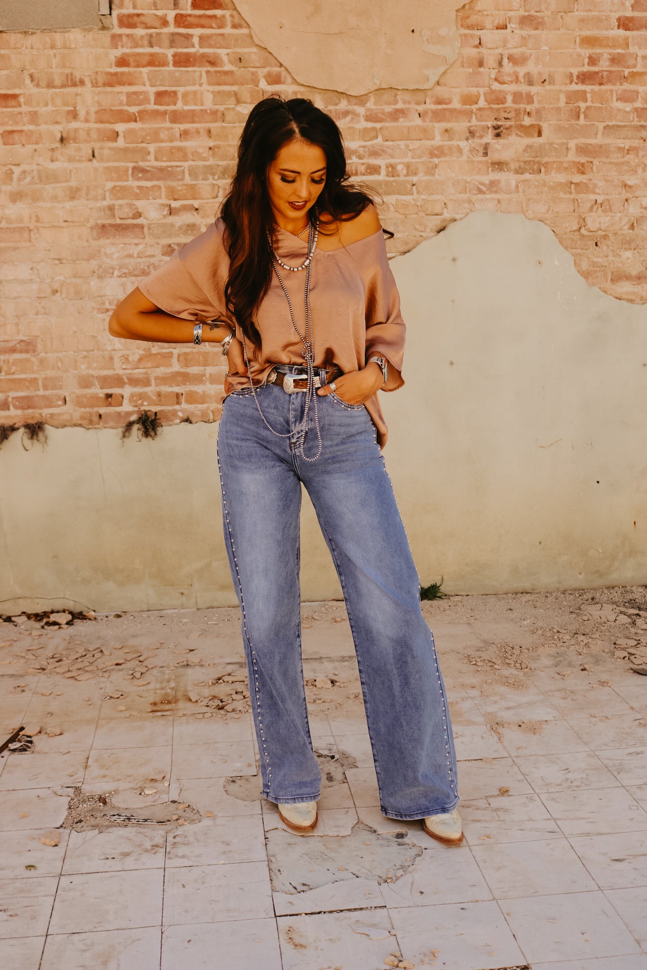 High Waisted Wide Leg Studded Trim Jean