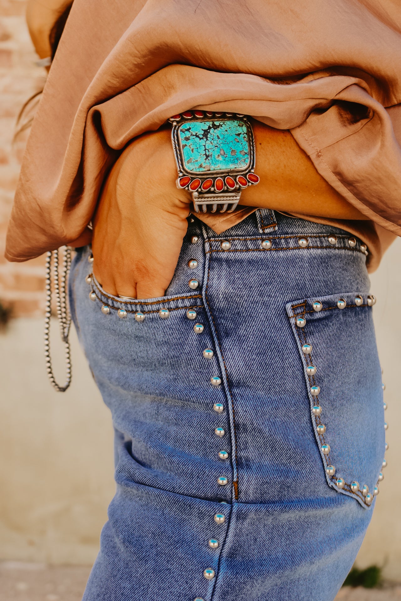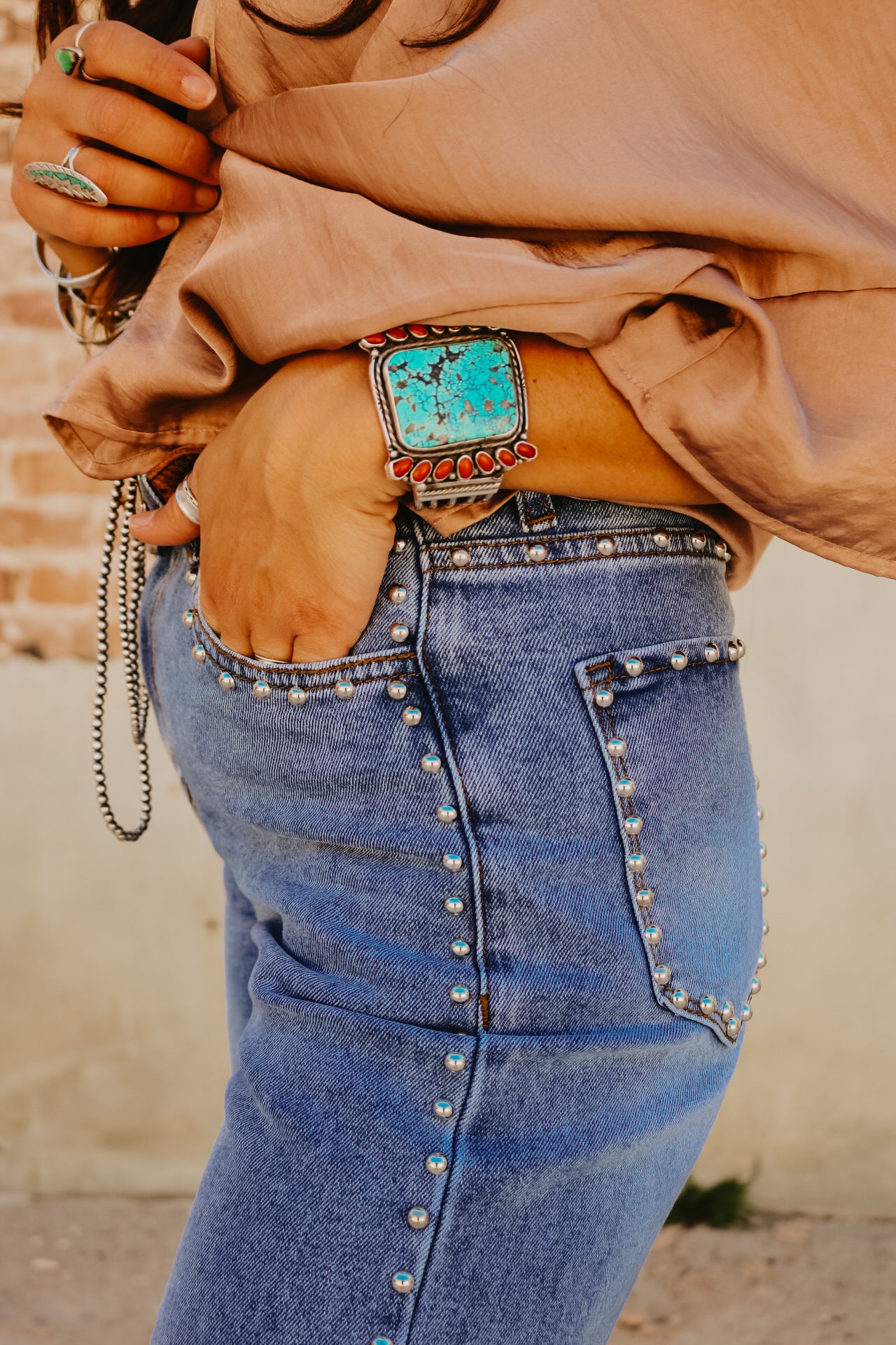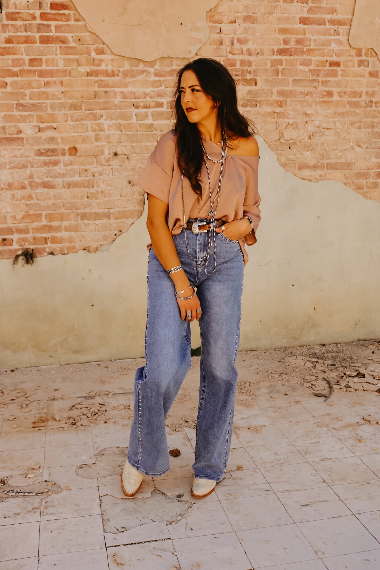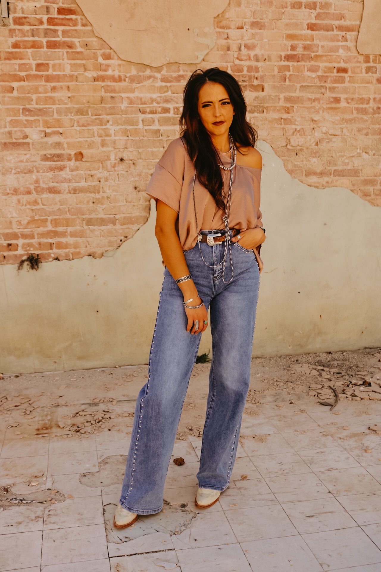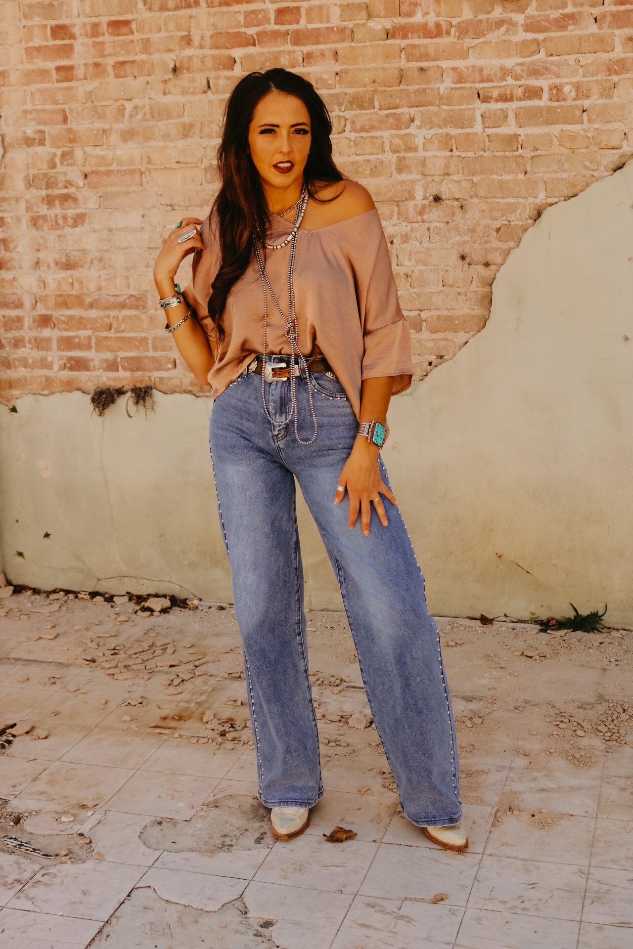 High Waisted Wide Leg Studded Trim Jean