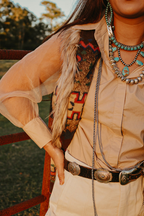 Nude Collared Button Down with Sheer Sleeves Gold button accents