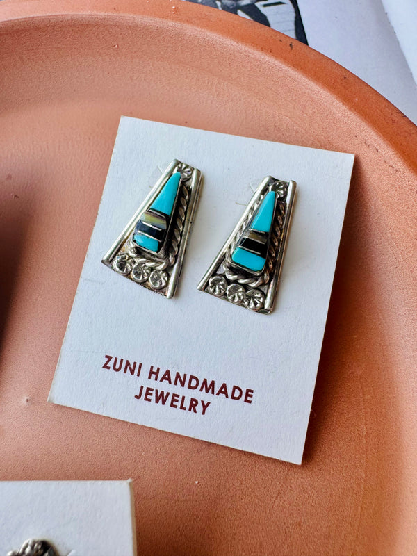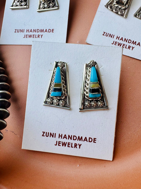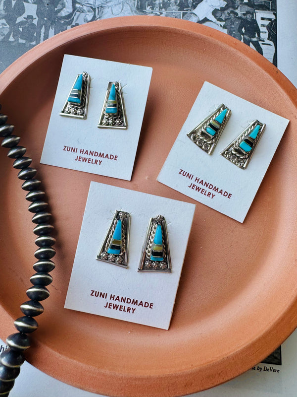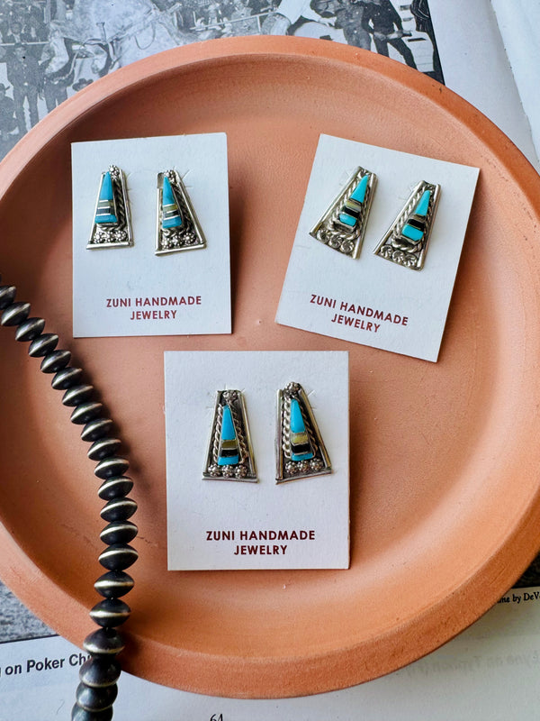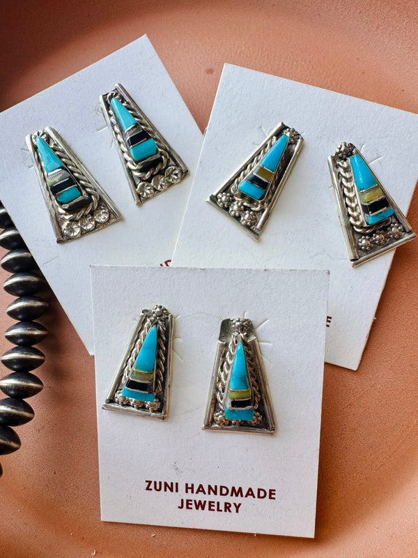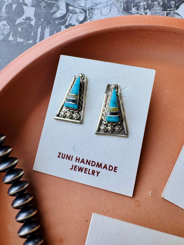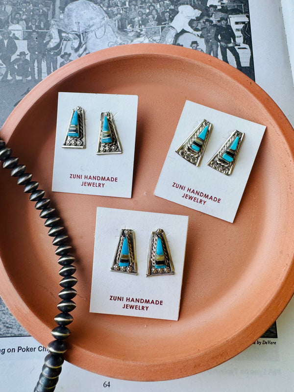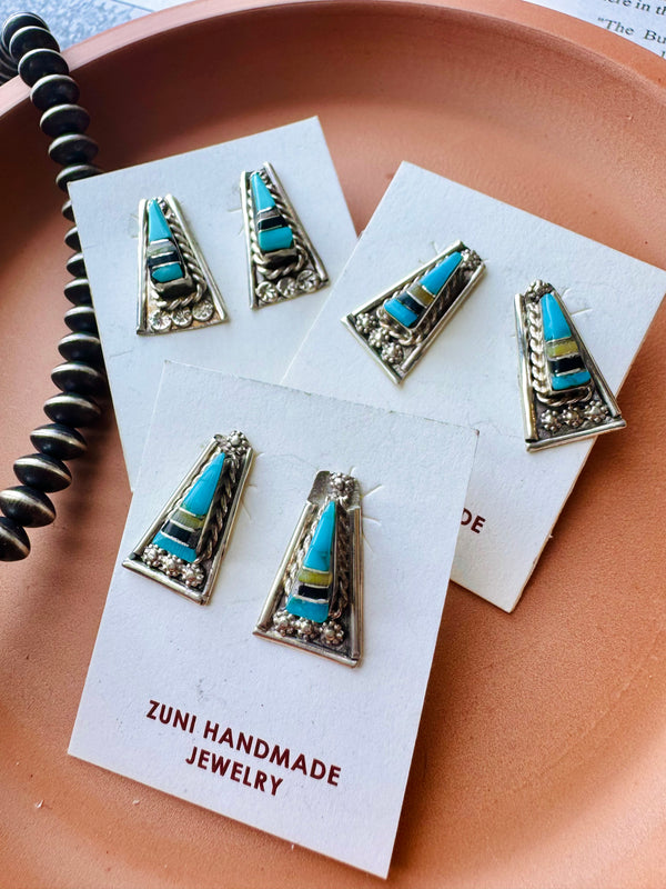Zuni Handmade Turquoise & Sterling Silver Funky Triangle Stud Earring