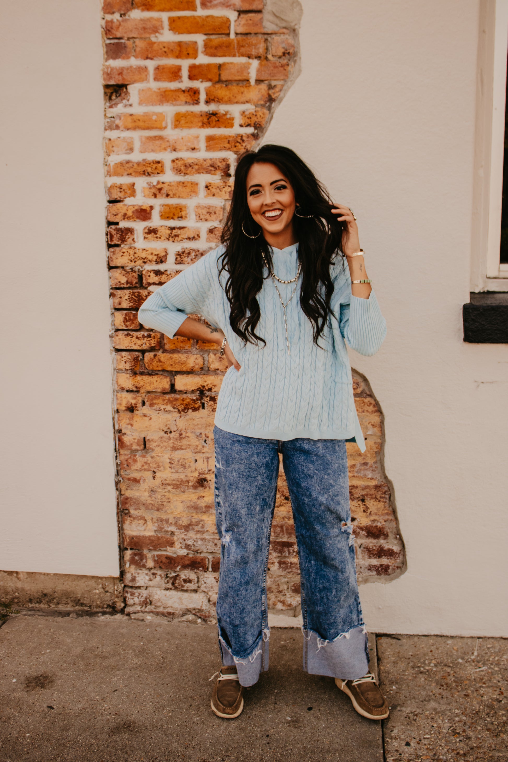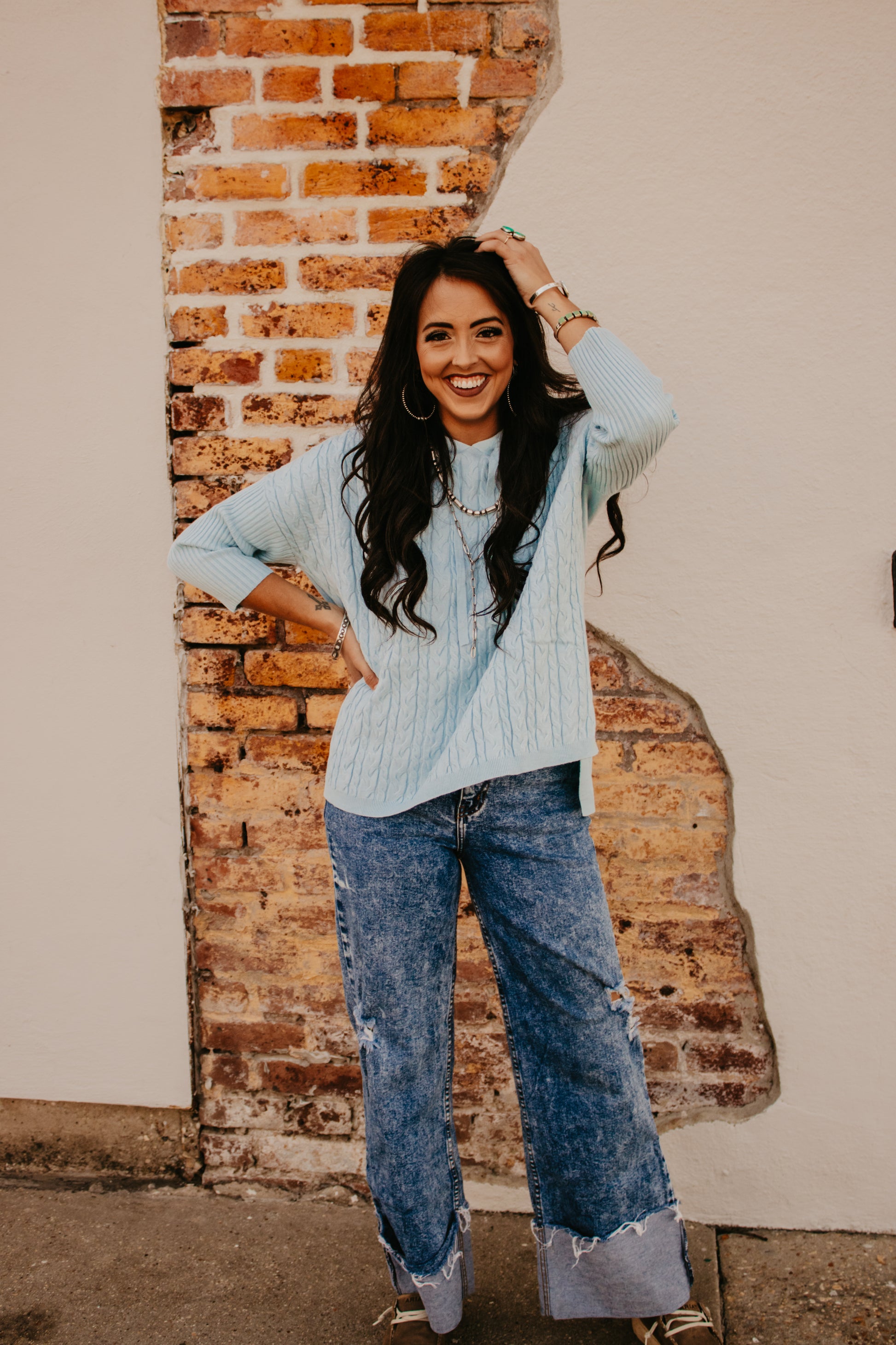 Sky Blue Cable Knit Dolman Sleeve Hooded Sweater