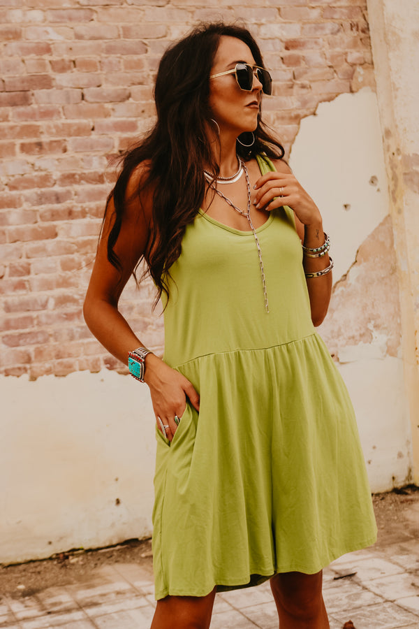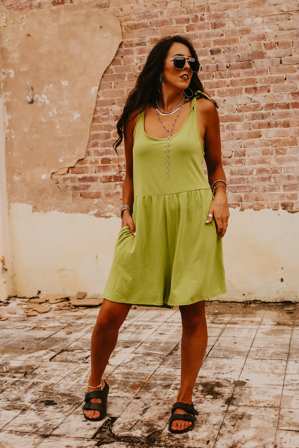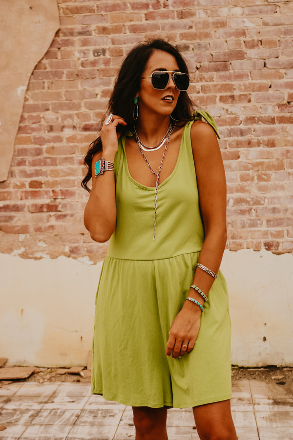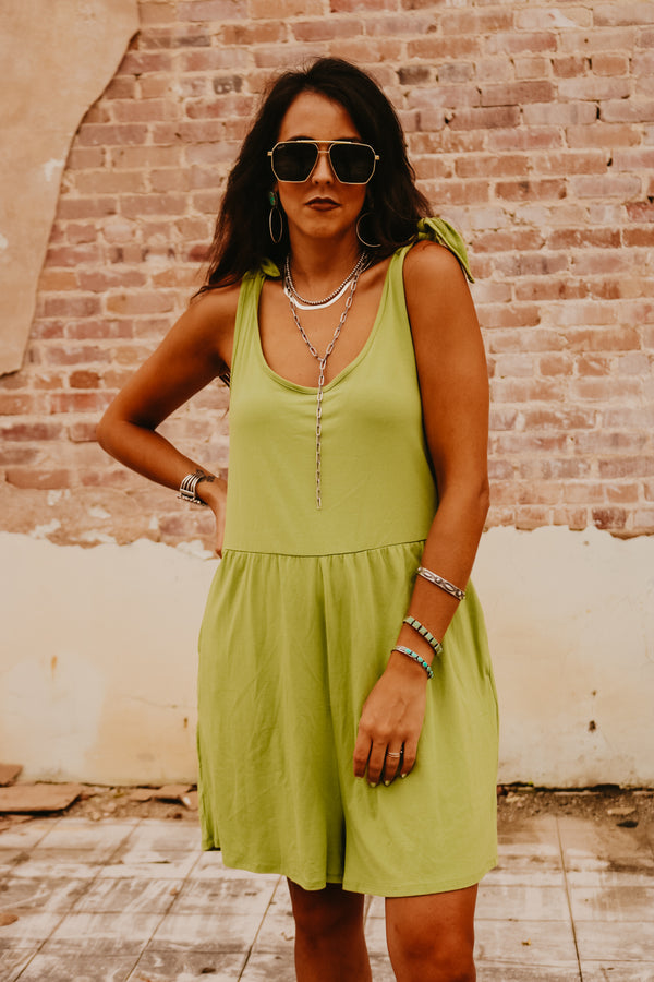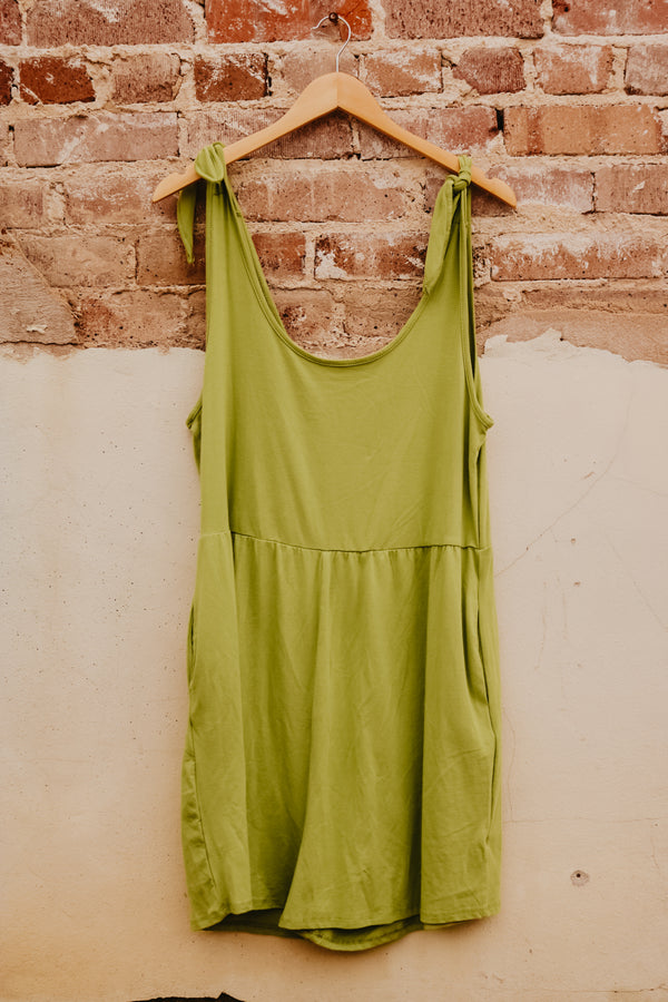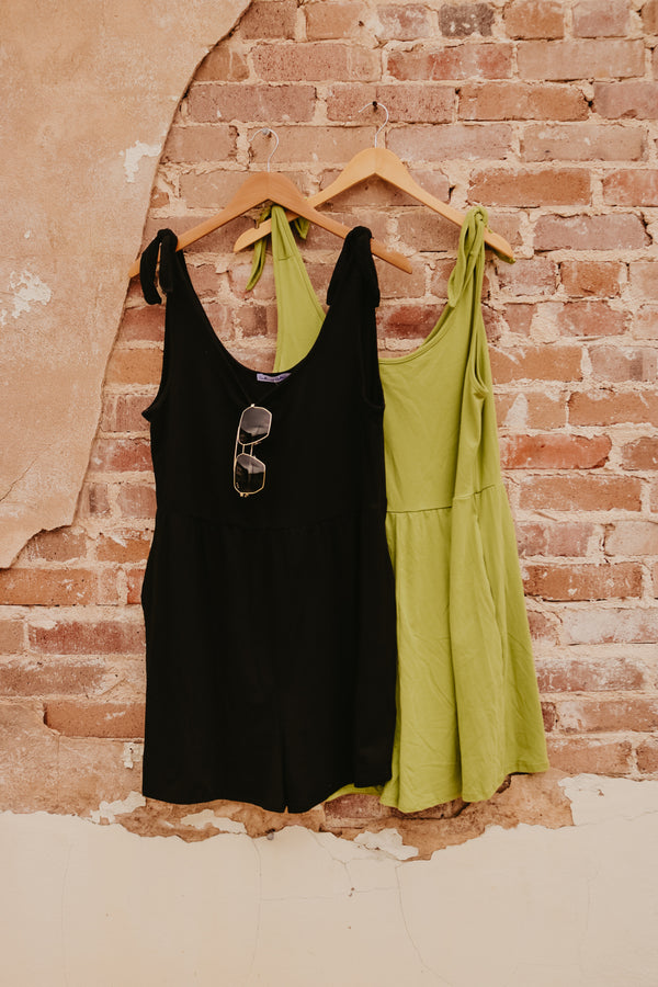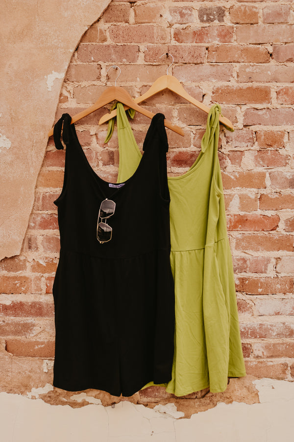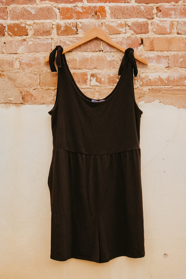 Baggy Shoulder Knot Romper  Lightweight Adjustable knot straps Front side pockets 60% Cotton 35% Rayon 5% Spandex ***RUNS BIGGER***