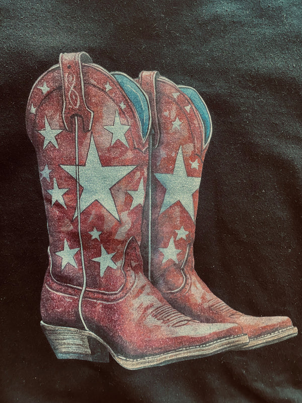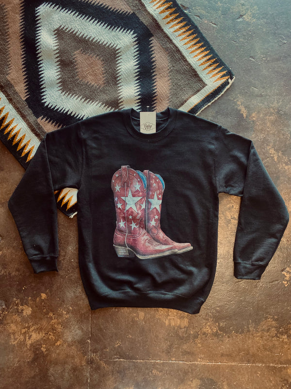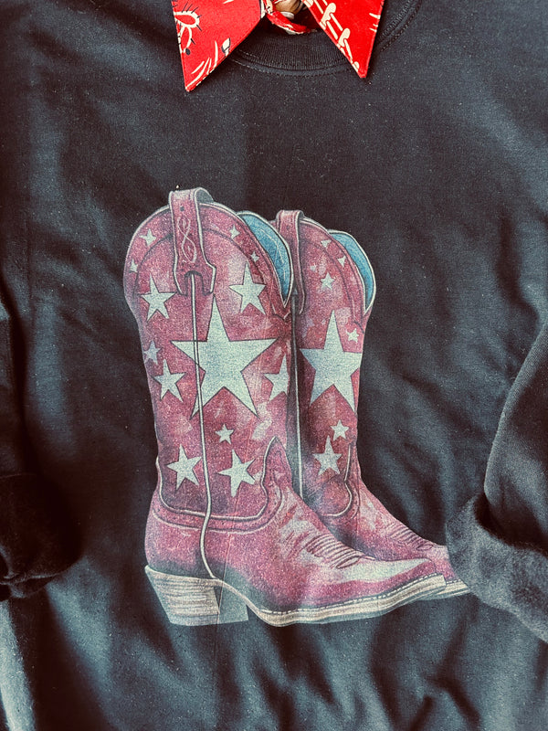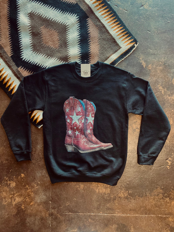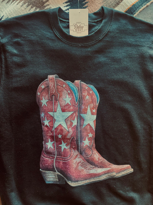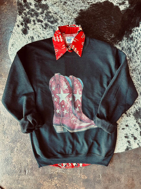 Red Boots with Star Detail Graphic on Black Sweatshirt  Heavy blend gildan 50% Cotton 50% Polyester