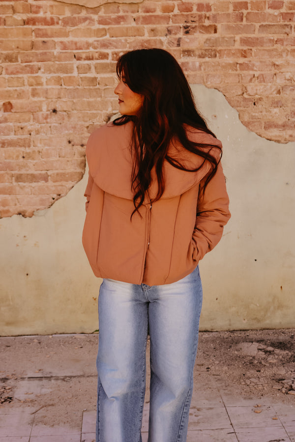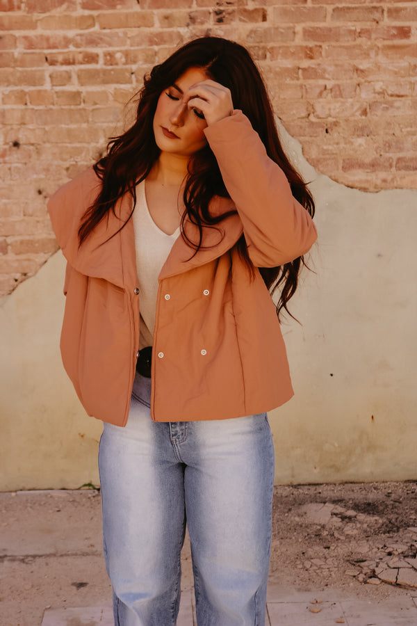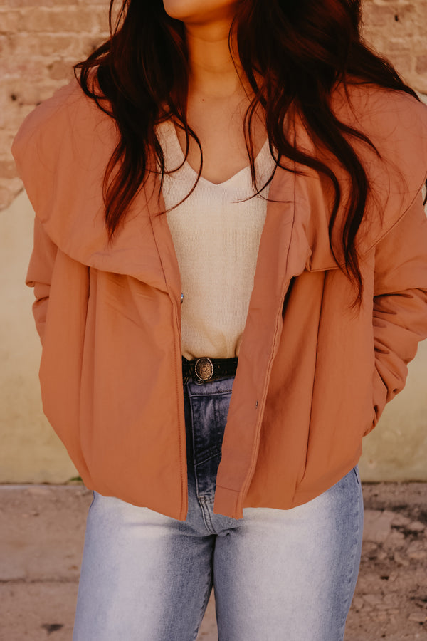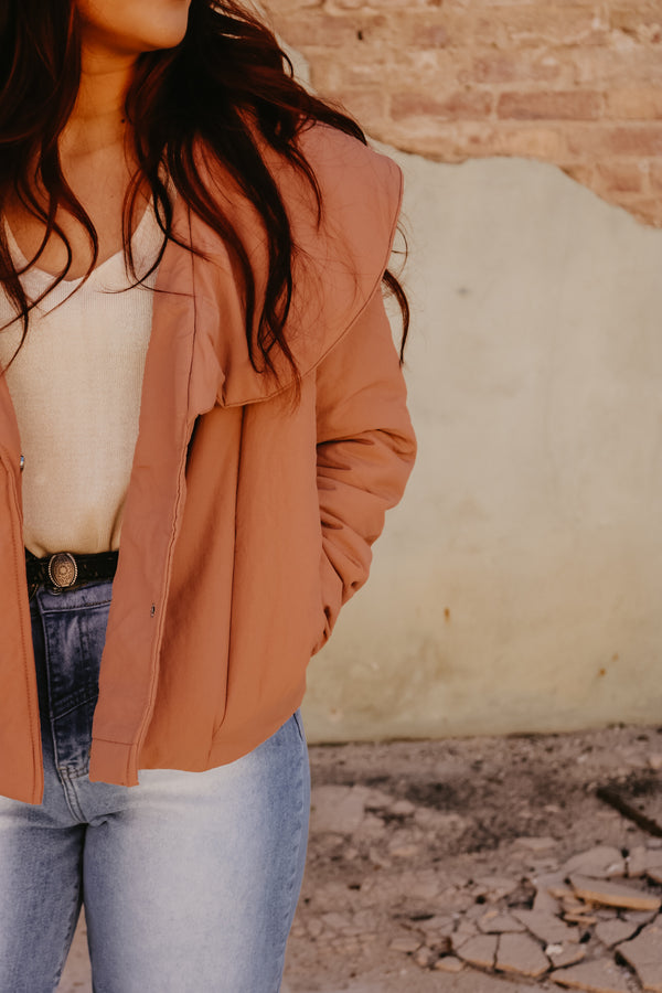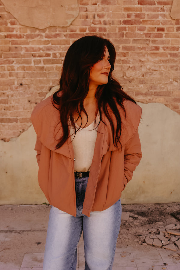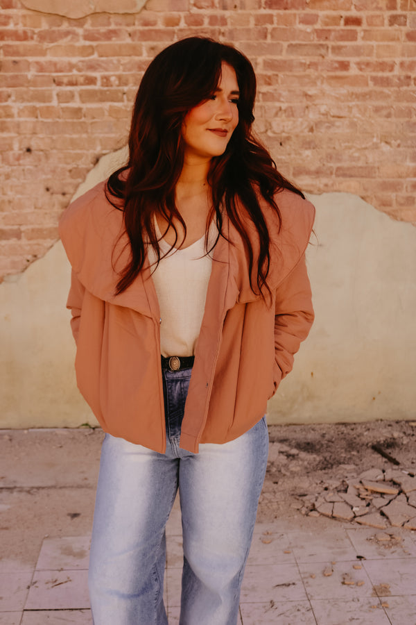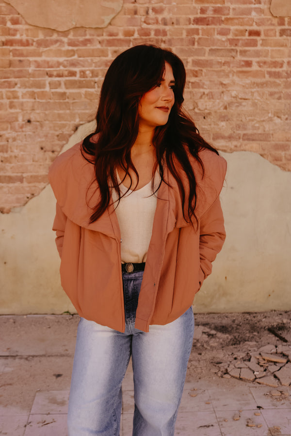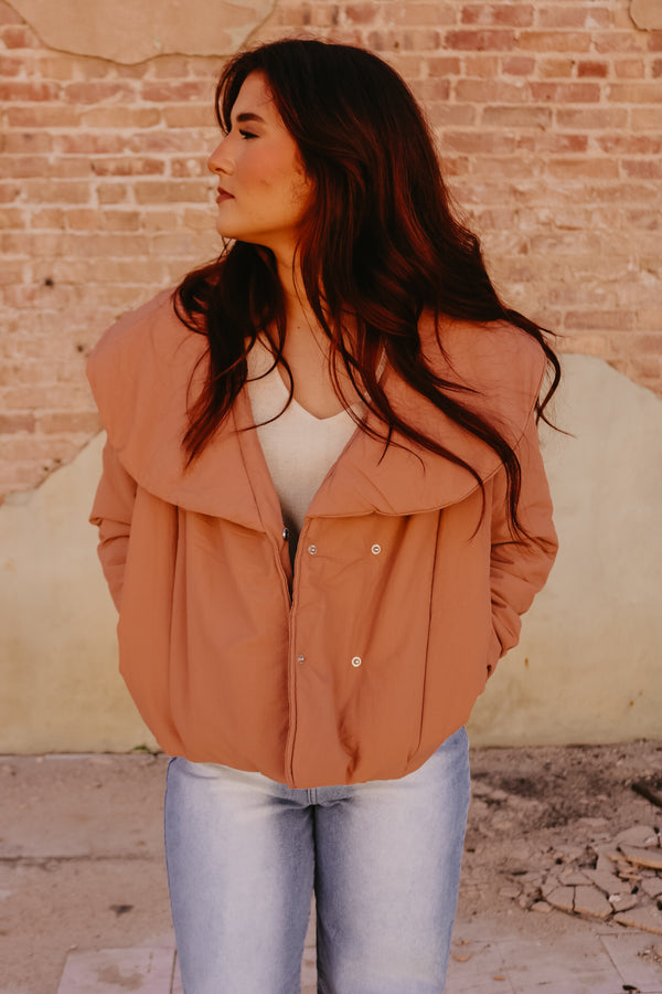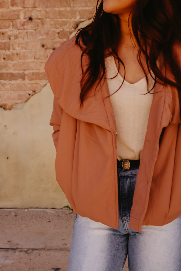 Muted Rusty Mauve Rounded Collar Lapel Jacket Shawl style collared jacket  Snap button closure Pockets 100% Polyester