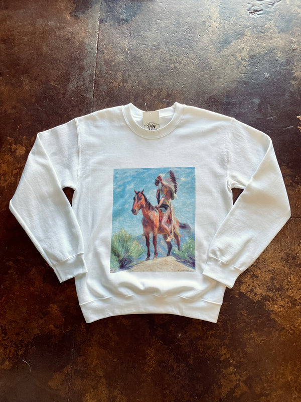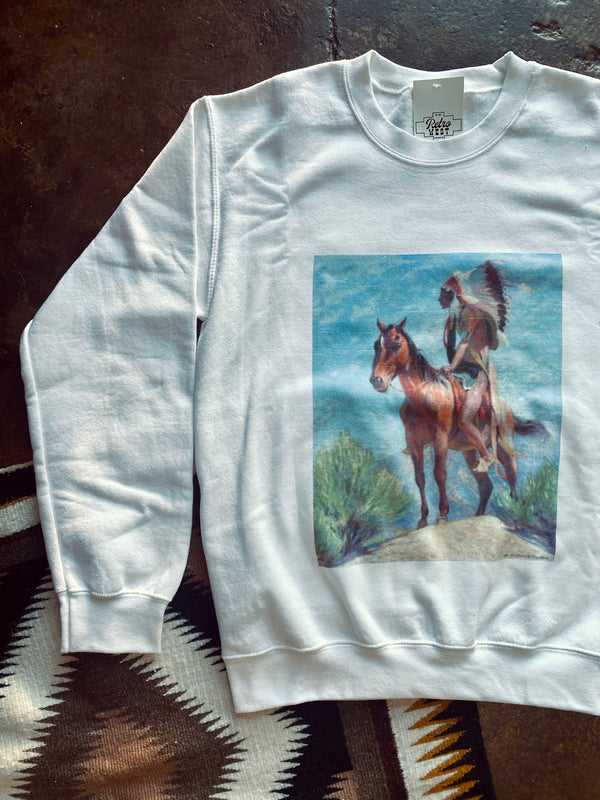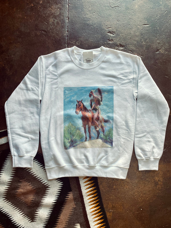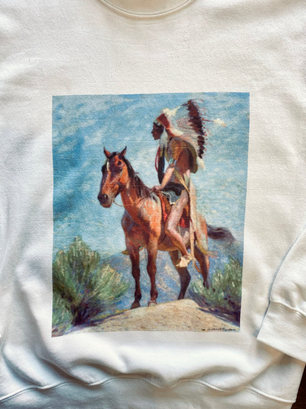 Licensed Graphic Indian Painting Scene Printed on White Sweatshirt  *FULLY LICENSED GRAPHIC* Heavy blend gildan  50% Cotton 50% Polyester