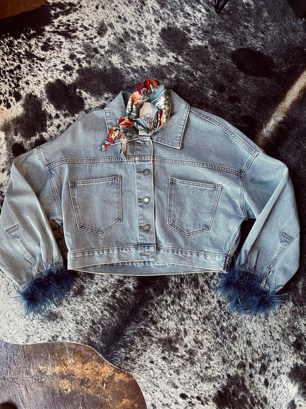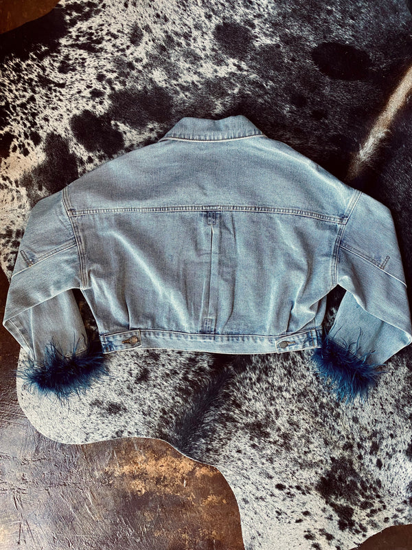 Black Denim Oversized Crop Fit Jacket with Feather Cuffs