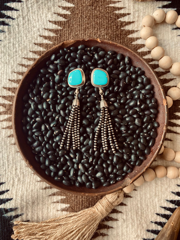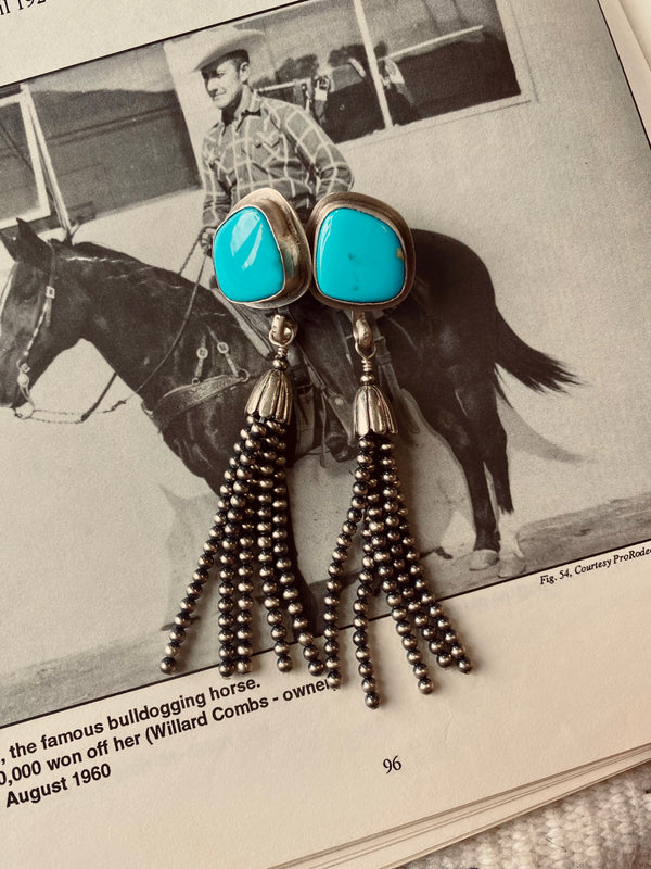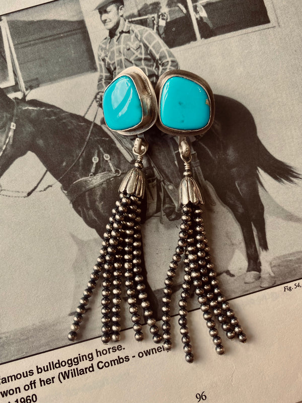 Large Chunky Blue Kingman Turquoise Stud Earring with Sterling Silver Navajo Pearl Beaded Fringe Tassels  4” total