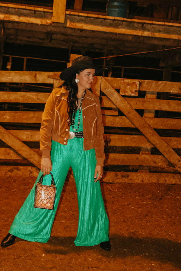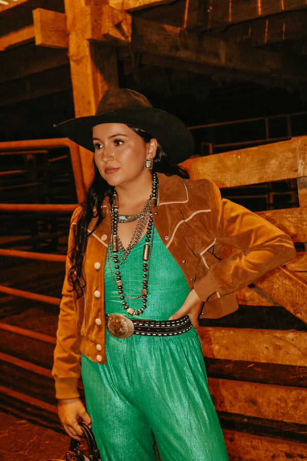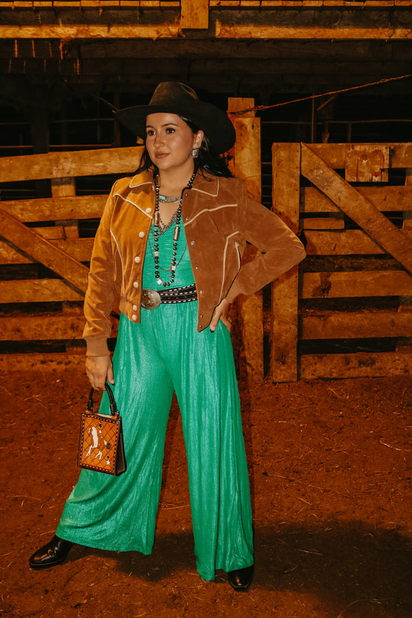 Metallic Emerald Gathered Ruched Waist Jumpsuit Open Back 97% Polyester 3% Spandex