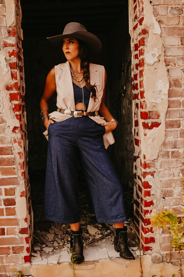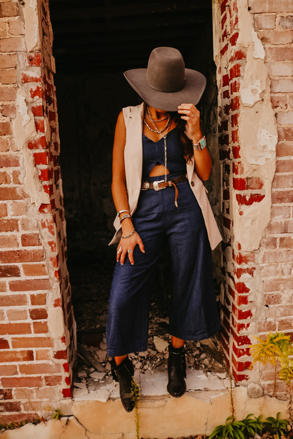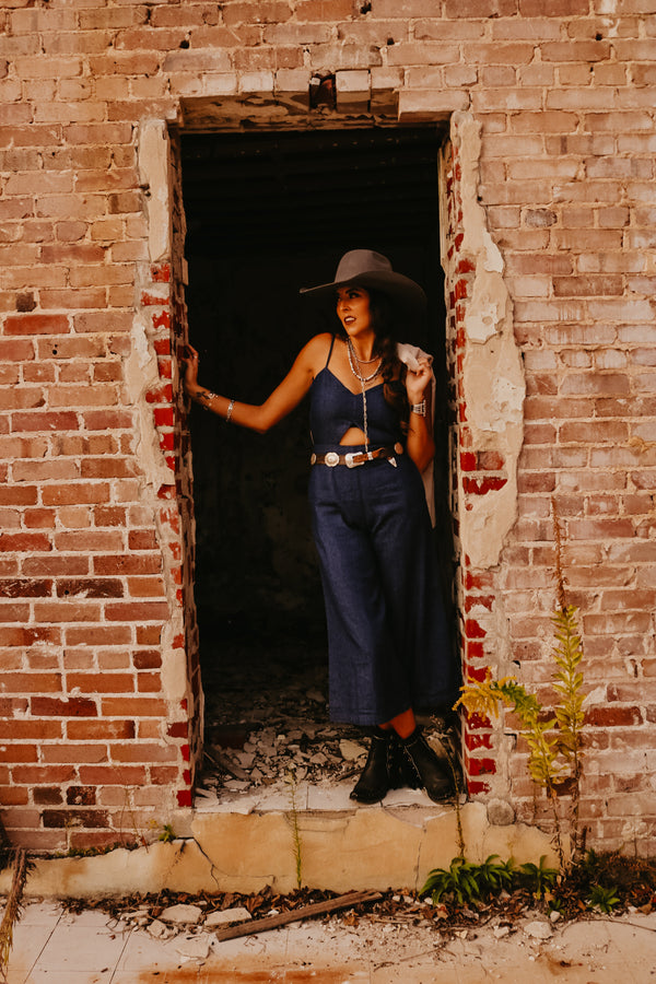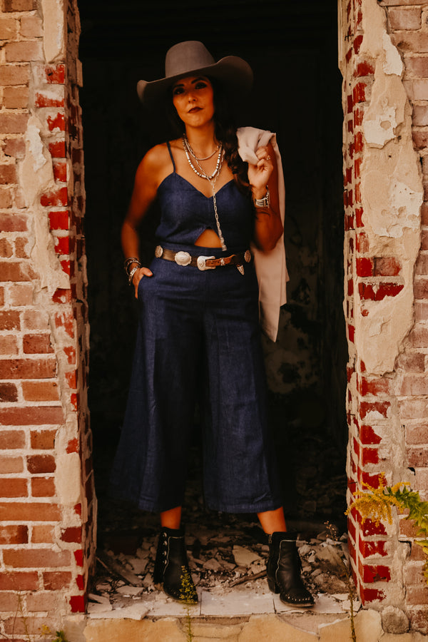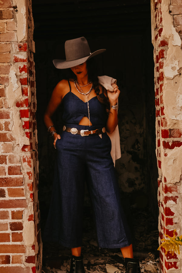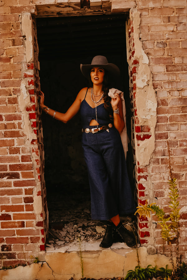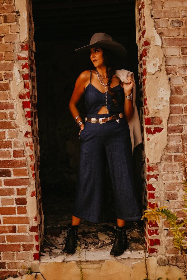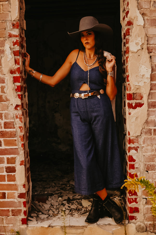 Ankle Length Denim Jumpsuit with Tie Back Cut out front Nonadjustable straps Invisible back zipper Dark colored thick denim fabric  100% Cotton