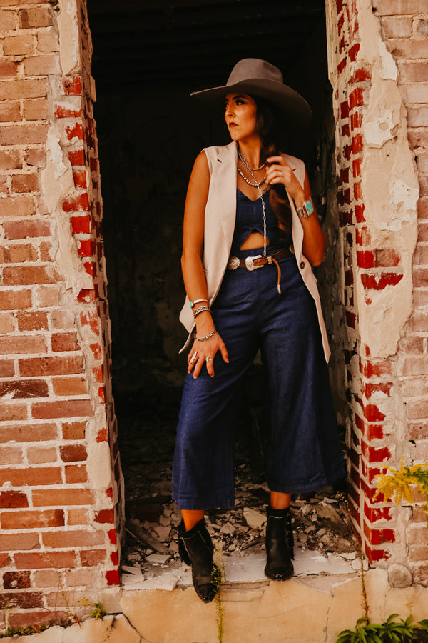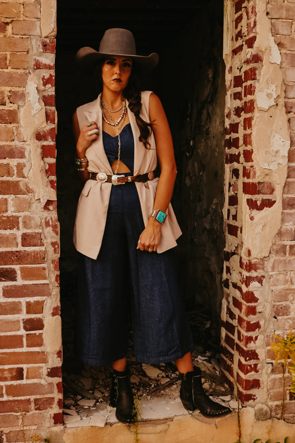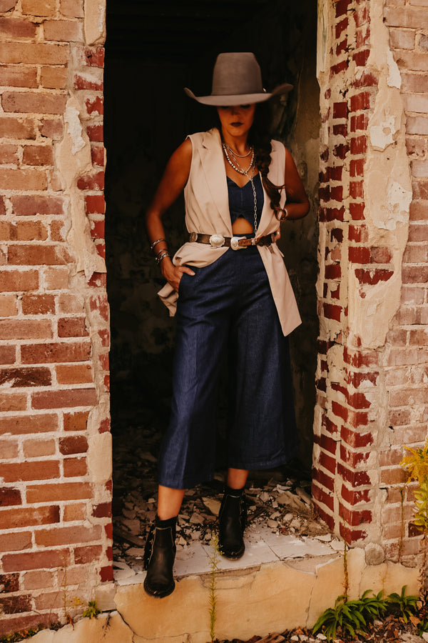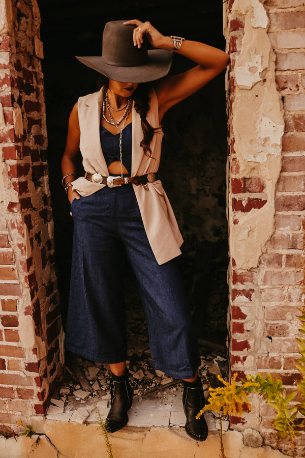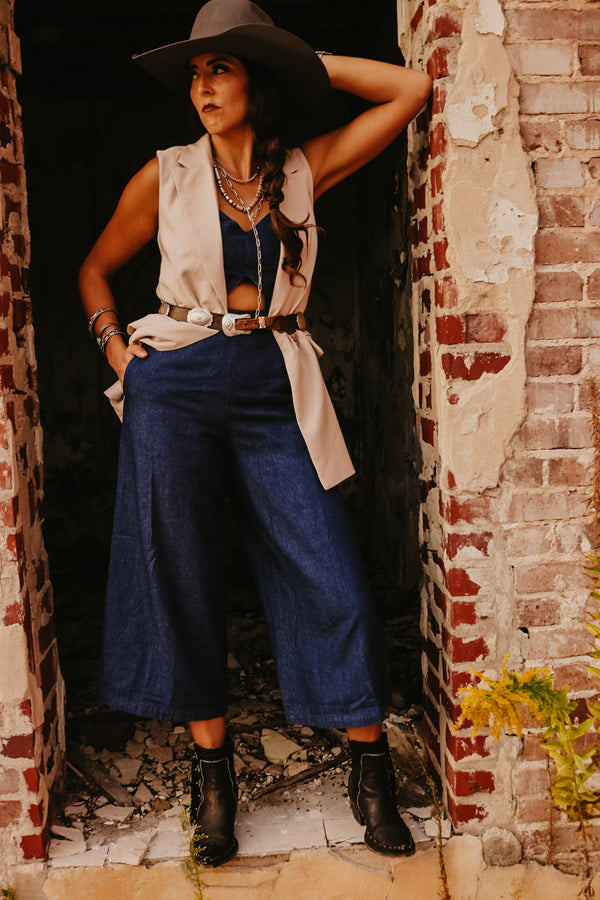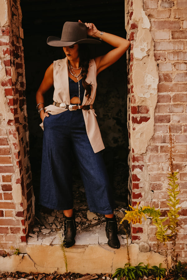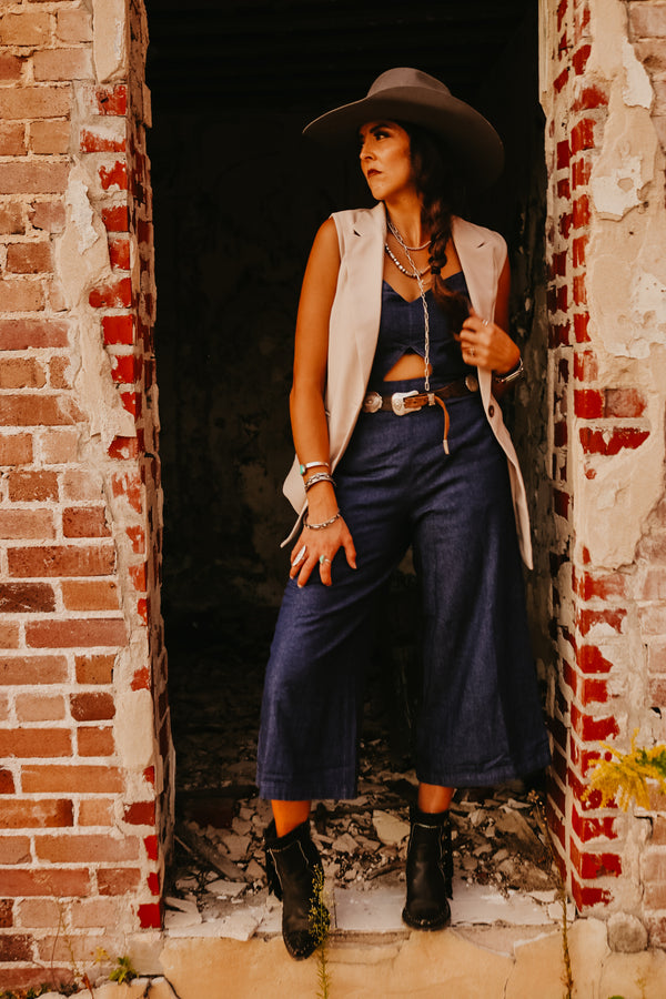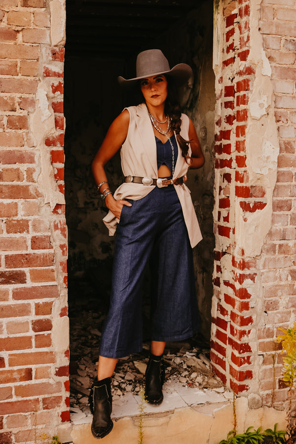 Ankle Length Denim Jumpsuit with Tie Back Cut out front Nonadjustable straps Invisible back zipper Dark colored thick denim fabric  100% Cotton