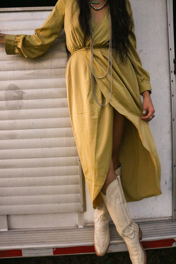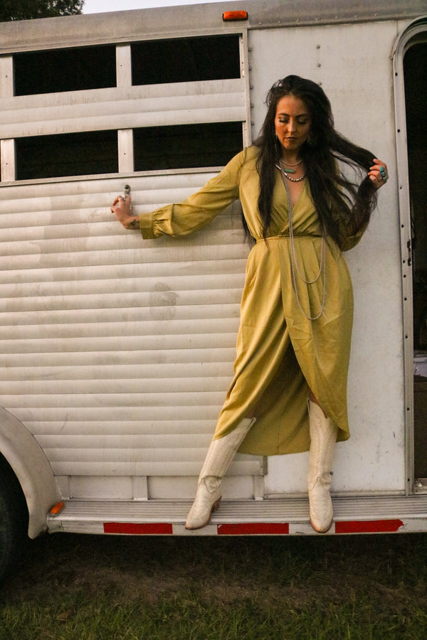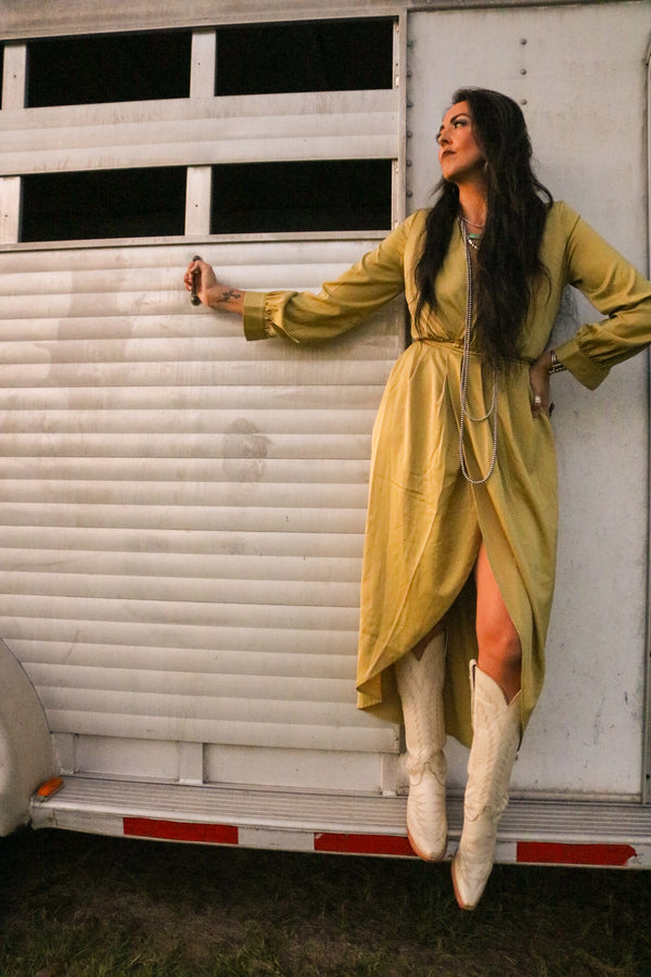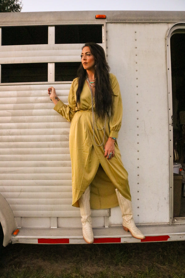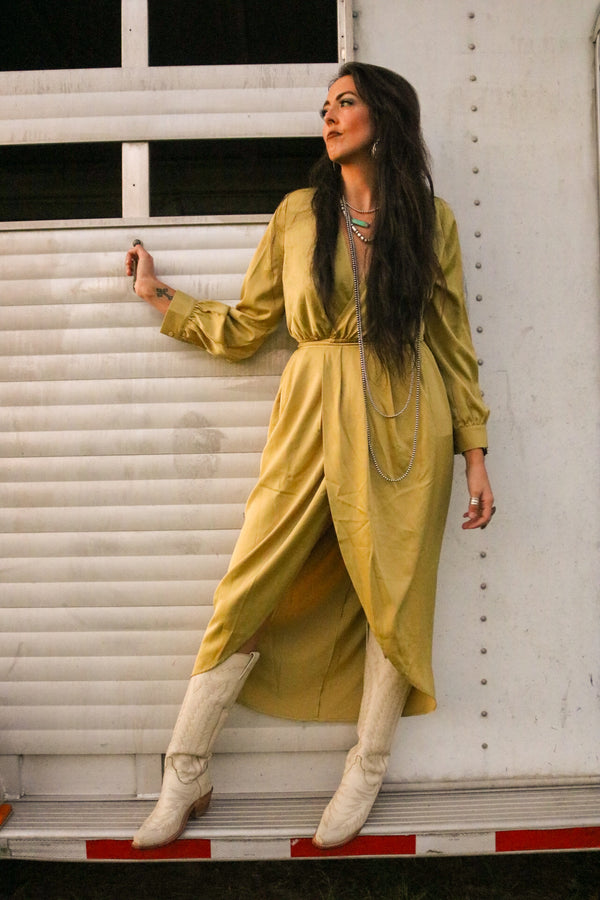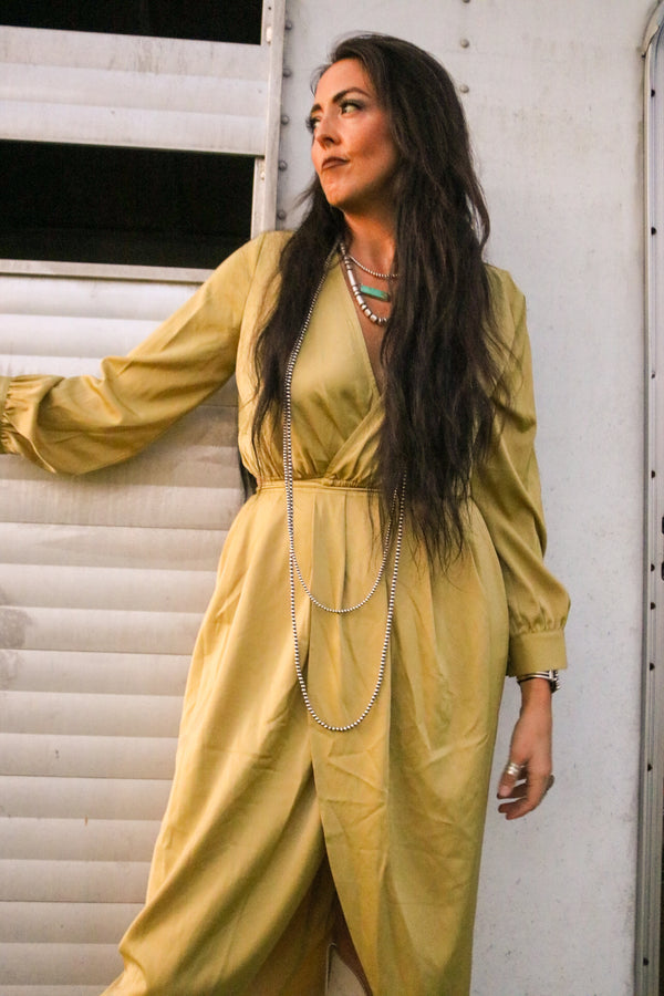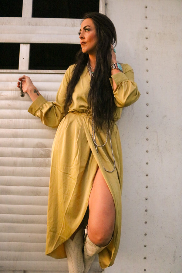 Muted Kiwi Satin Long Sleeve Wrap Top and High-Low Skirt Set Built in shorts Wrap tie front top Self: 97% Polyester 3% Spandex / Lining: 100% Polyester
