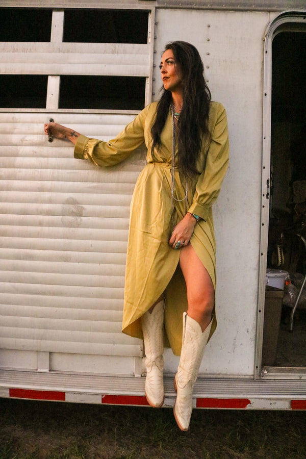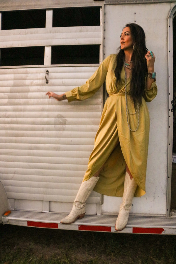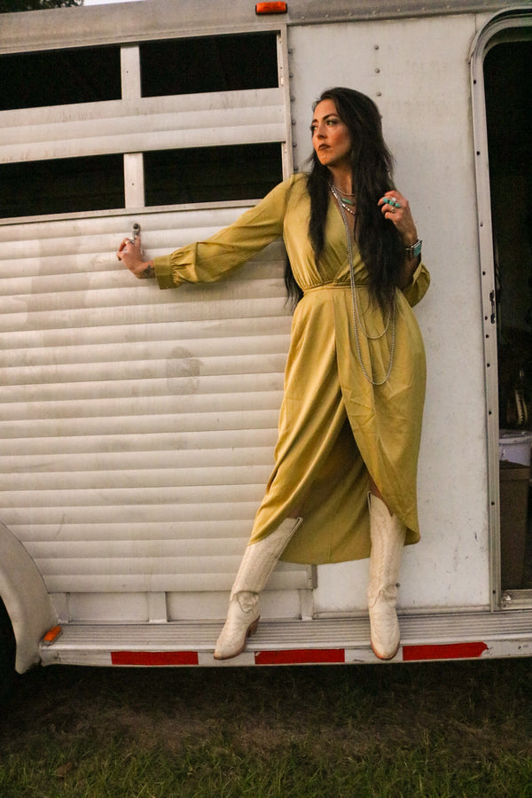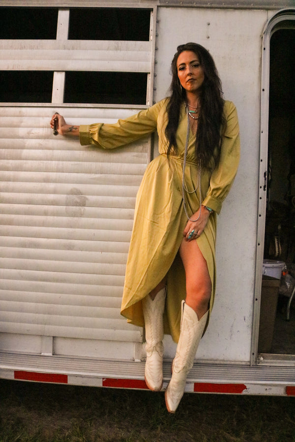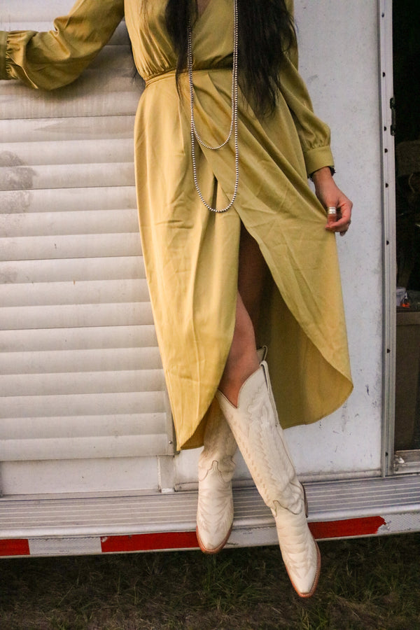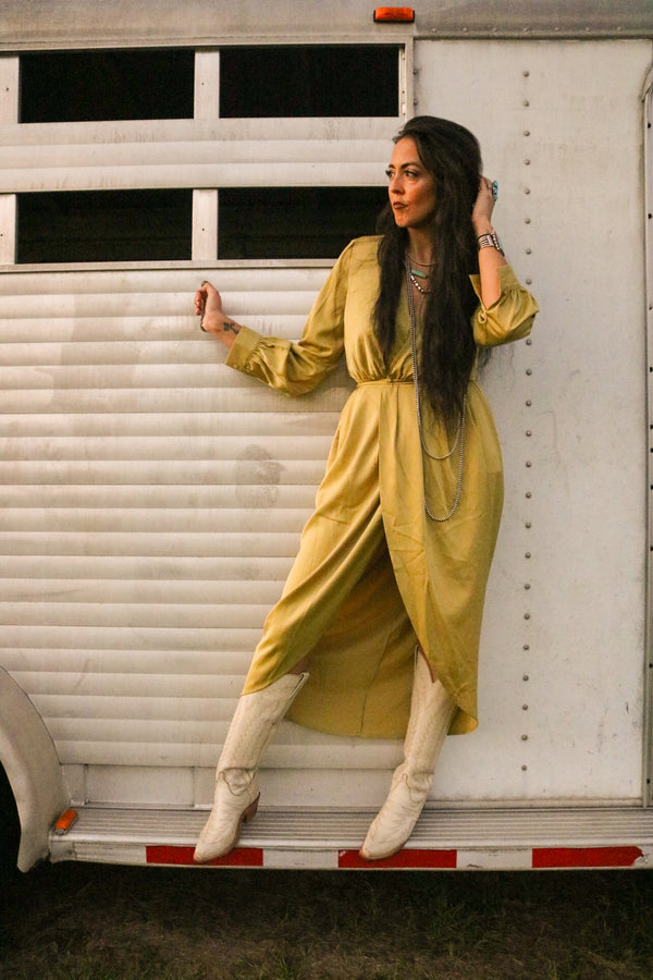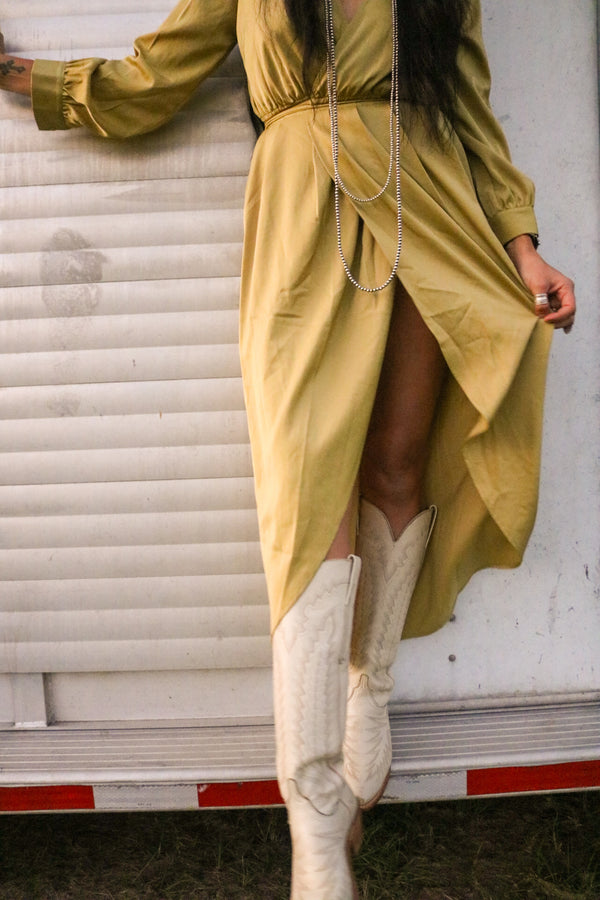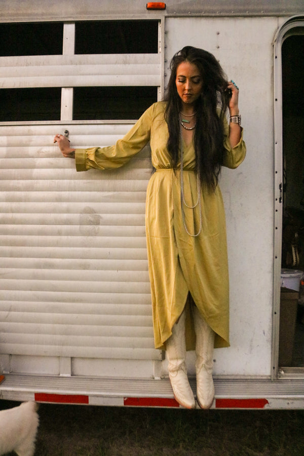 Muted Kiwi Satin Long Sleeve Wrap Top and High-Low Skirt Set Built in shorts Wrap tie front top Self: 97% Polyester 3% Spandex / Lining: 100% Polyester