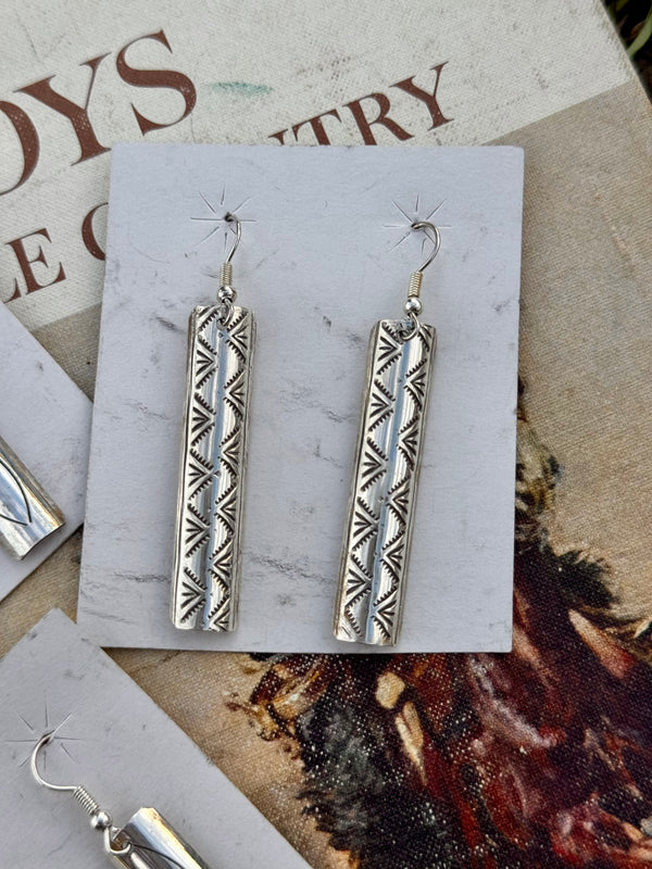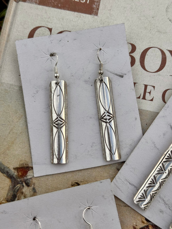 Sterling Silver Southwest Stamped Dangle Earrings 1.75” silver slab length .50” dangle drop