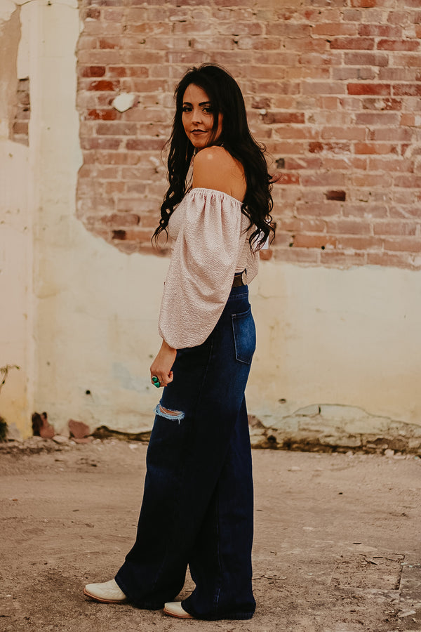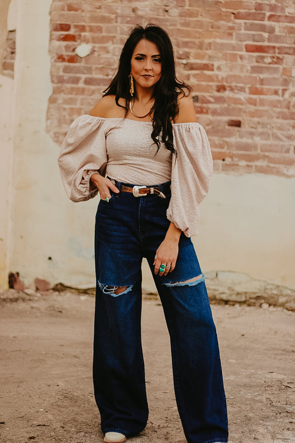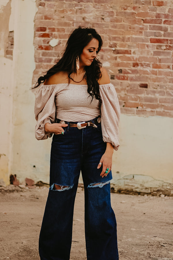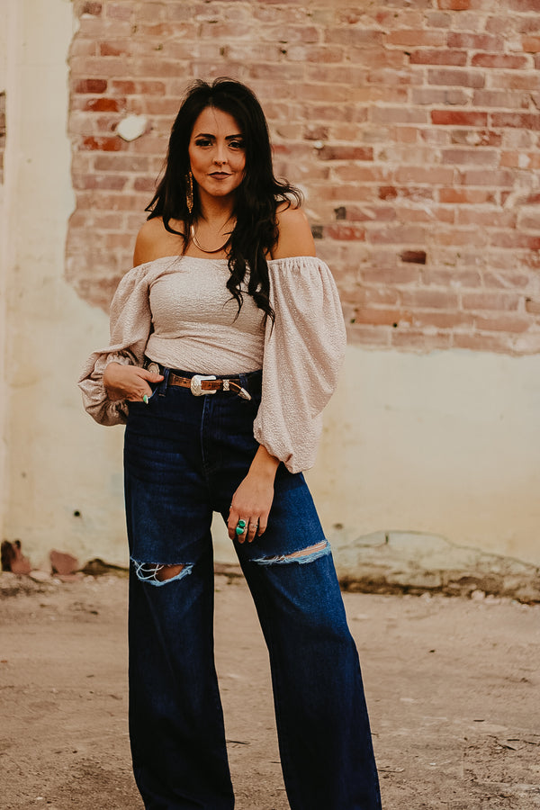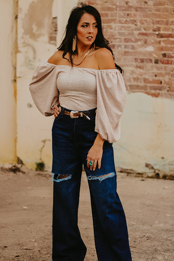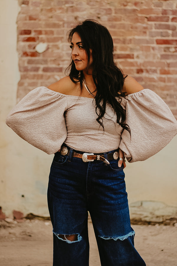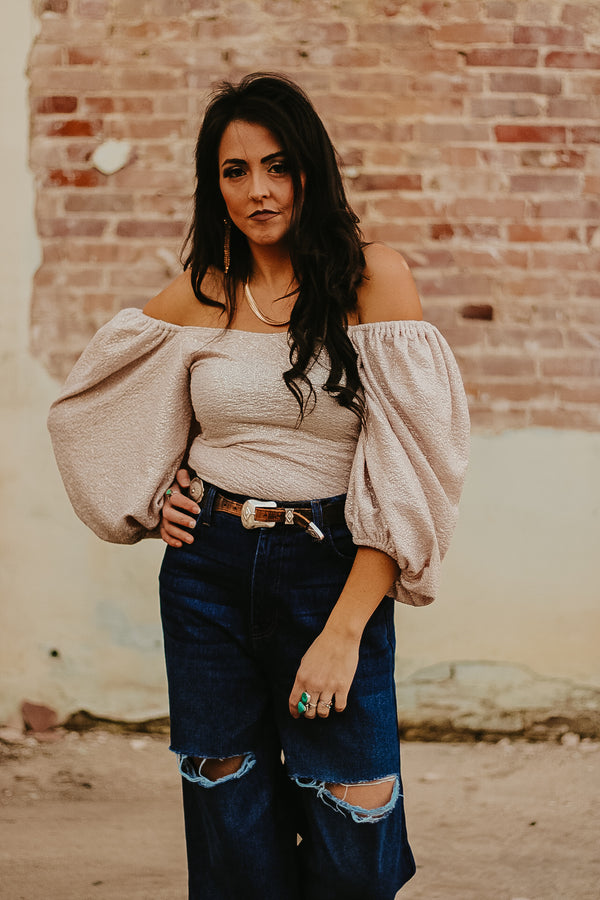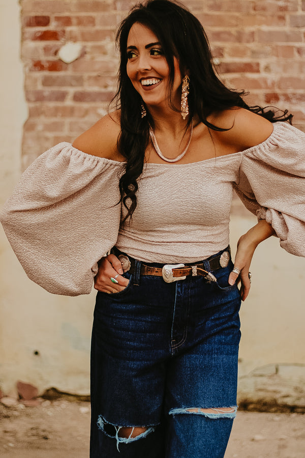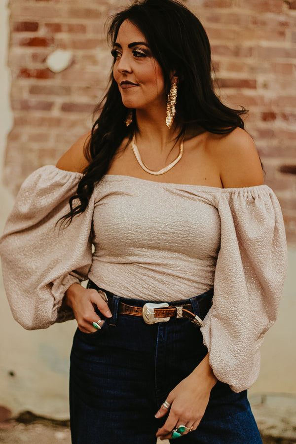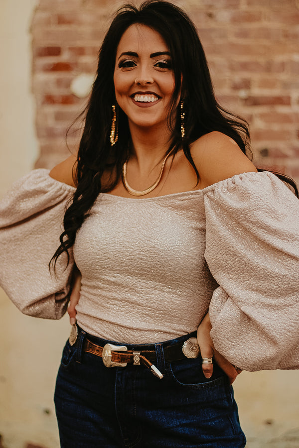 Champagne Lantern Sleeve Bodysuit with Gold Glitter Accents Double snap closure