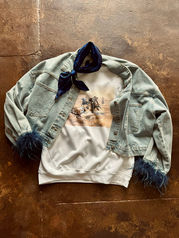 White Wild West Vintage Cowboy Painting Graphic Sweatshirt   *****Denim Feather Cuff Jacket NOT INCLUDED*****