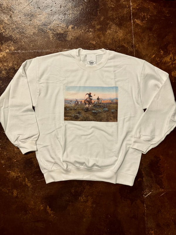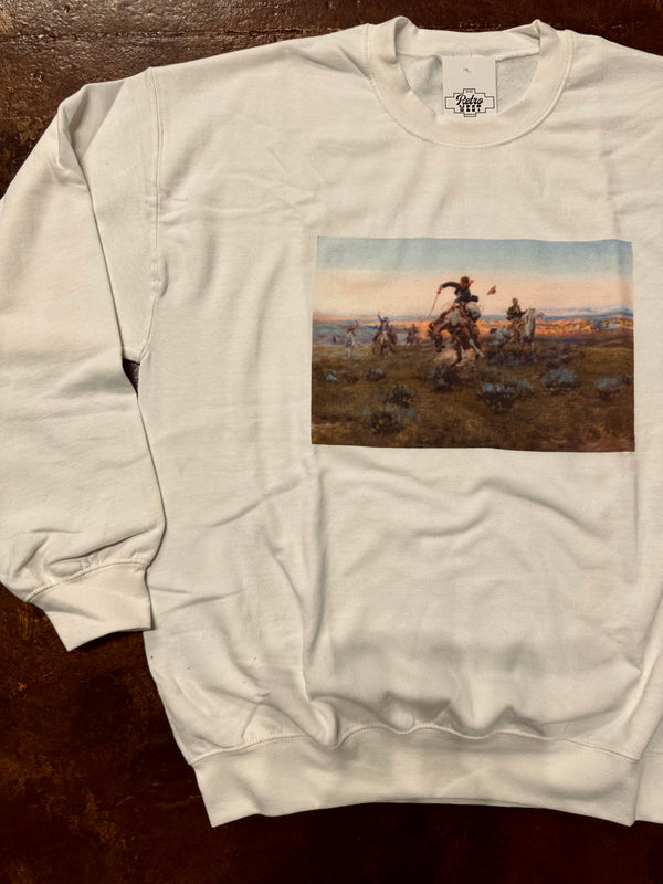 Licensed Graphic Bucking Horse & Cowboy Western Painting Scene Printed on White Sweatshirt *FULLY LICENSED GRAPHIC* Heavy blend Gildan 50% Cotton 50% Polyester
