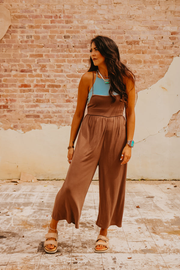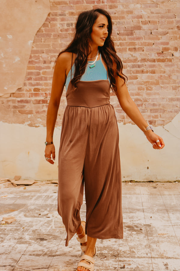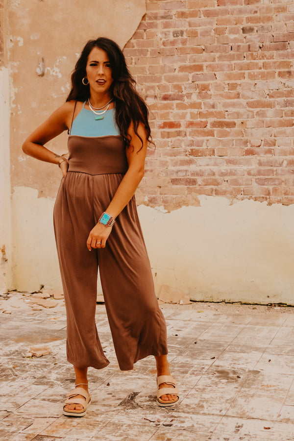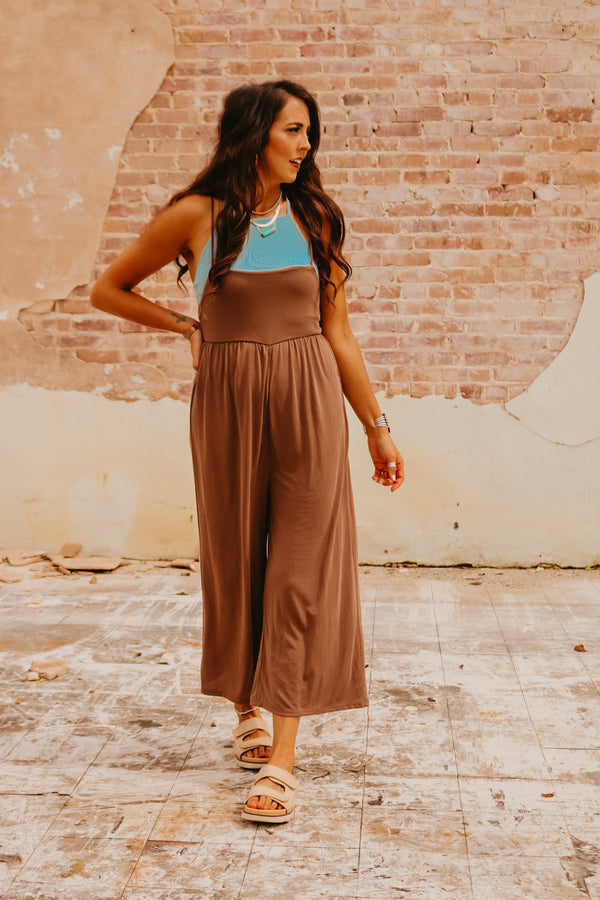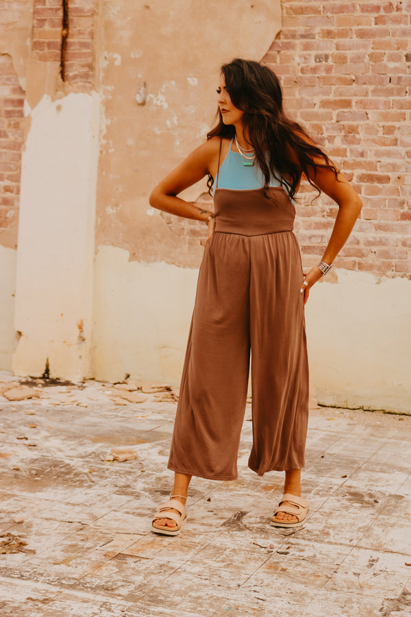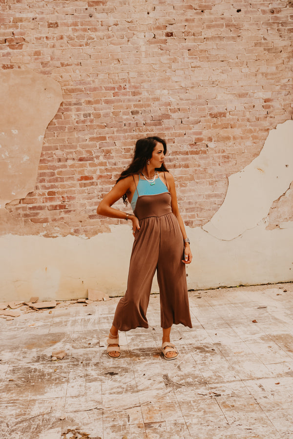 Cocoa Relaxed Wide Leg Jumpsuit with Smocked Back SUPER soft Adjustable straps Elastic smocked back ***Paired with our "Zena" bralette top in "dusty blue"***