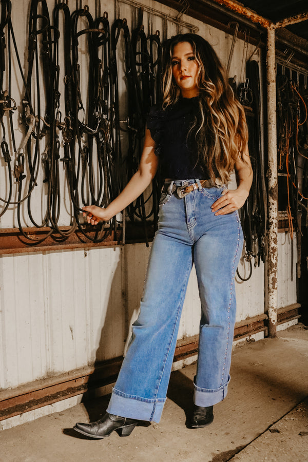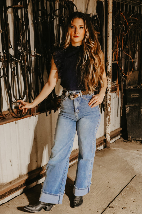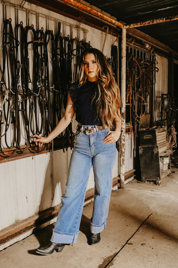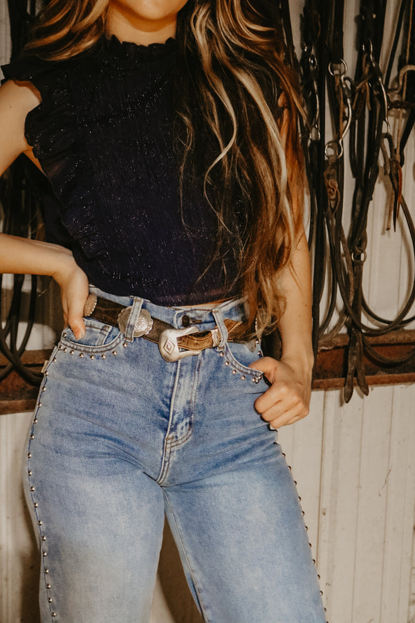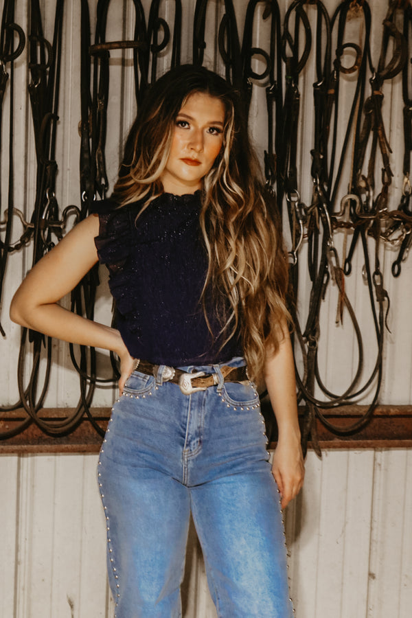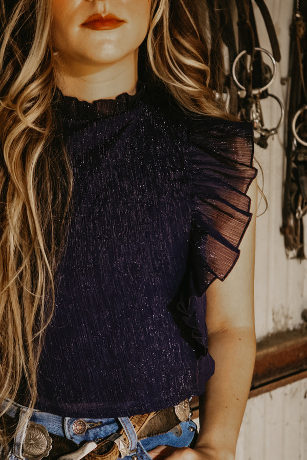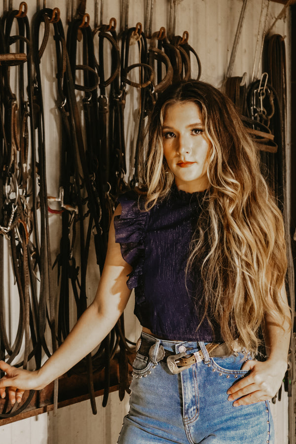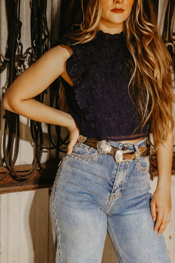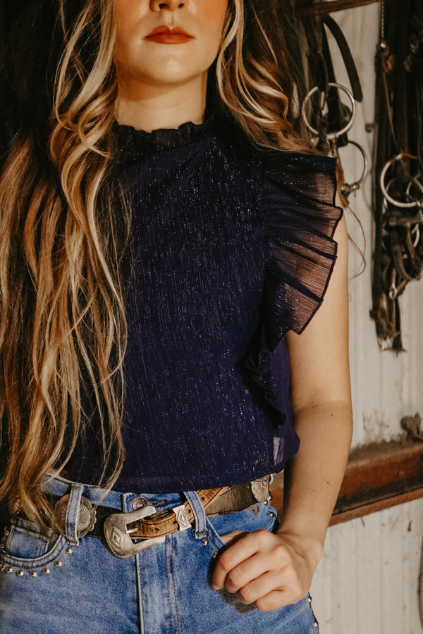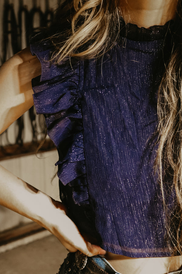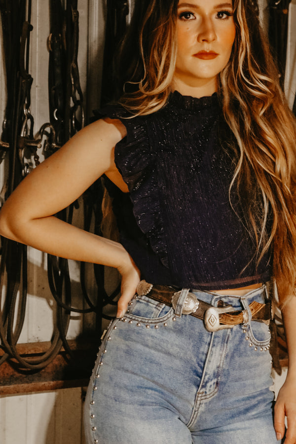 Navy Ruffle Detailed Shimmer Top crop length keyhole back with button