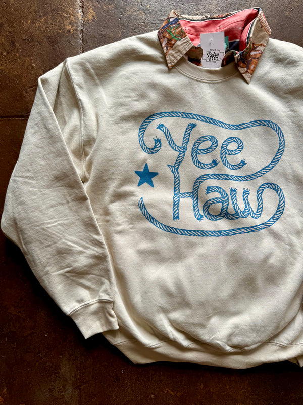 Sand Sweatshirt with Blue “Yee Haw” Rope Wording Graphic Print 50% Cotton 50% Polyester