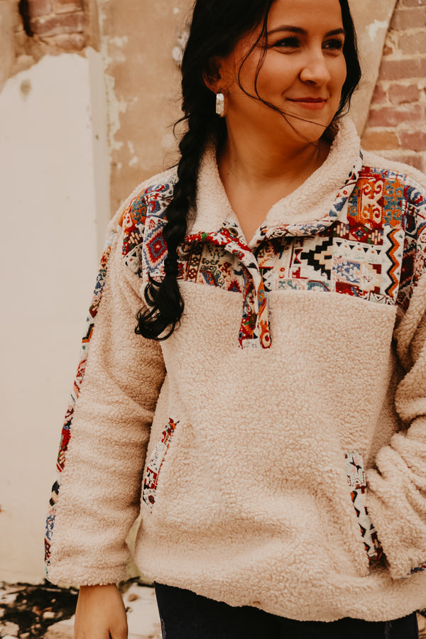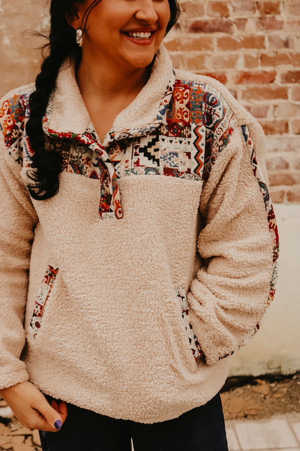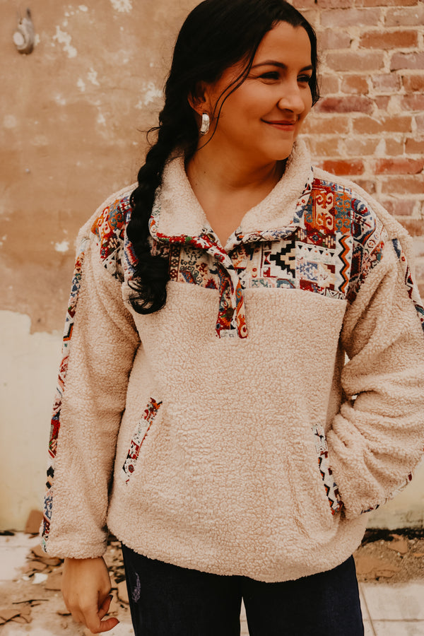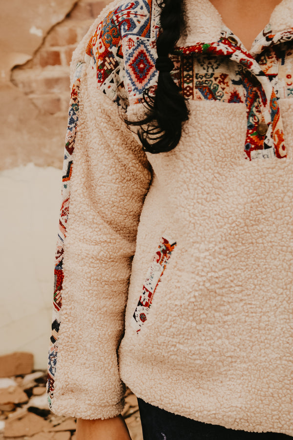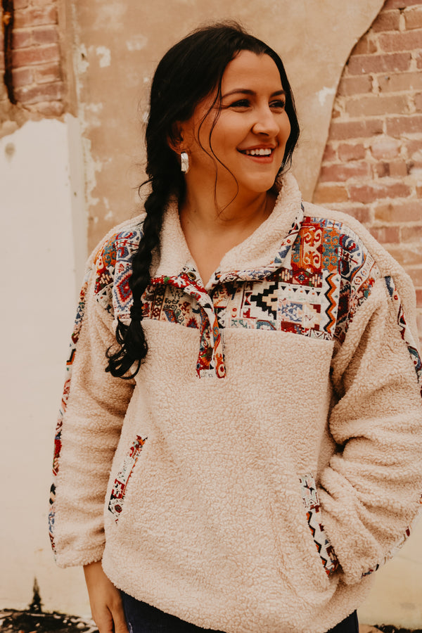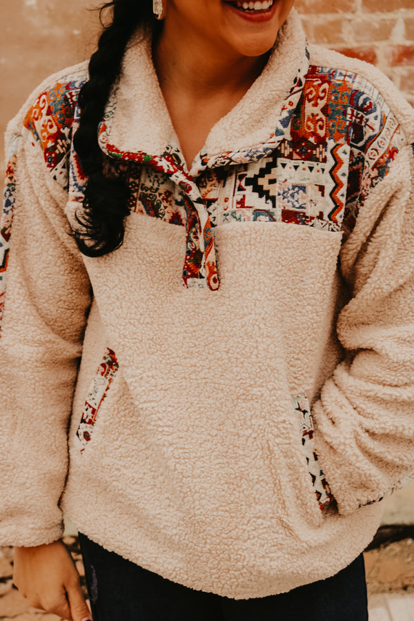 Sherpa Pullover with Aztec Shoulder, Bust, & Trim Detail