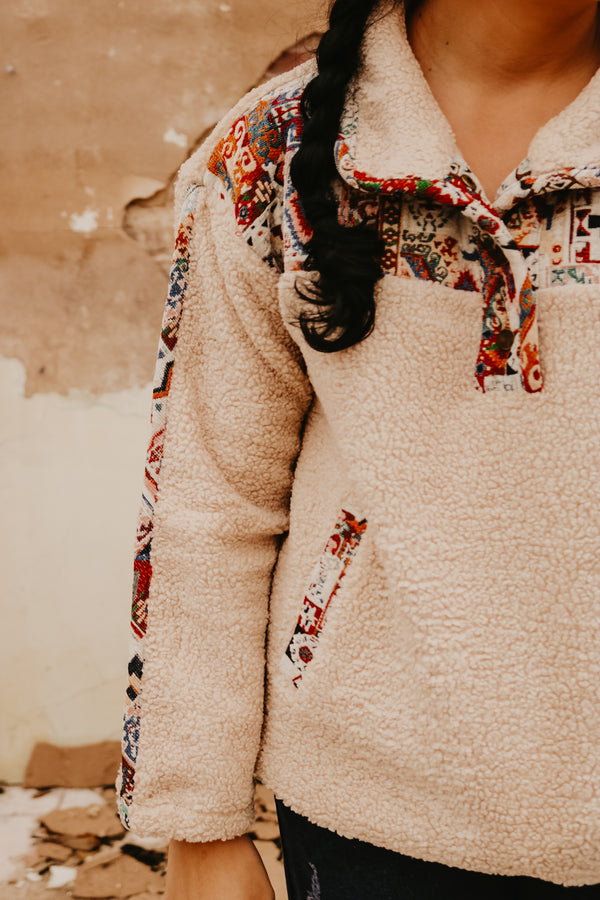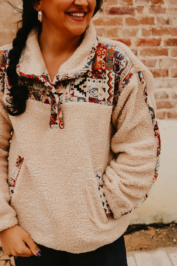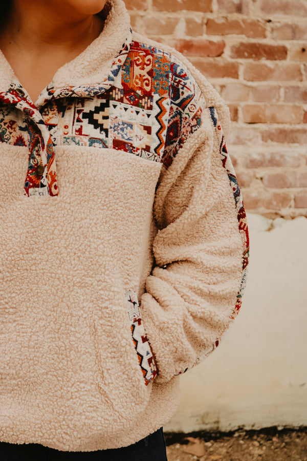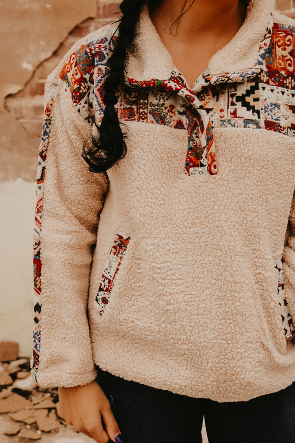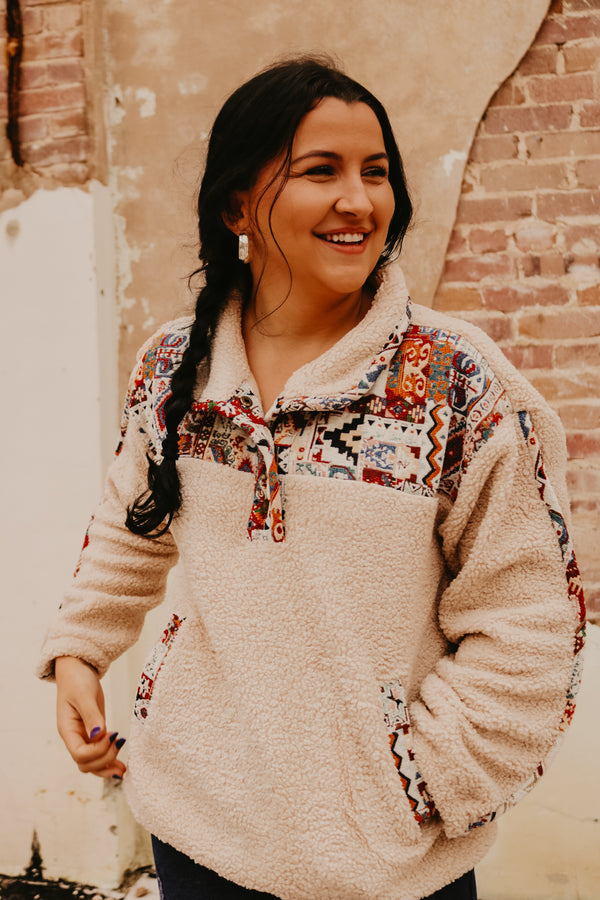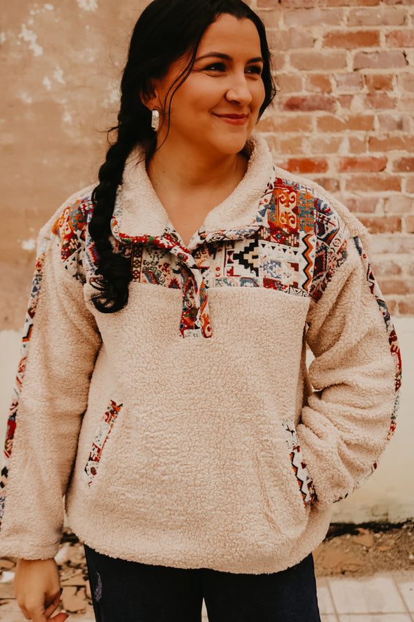 Sherpa Pullover with Aztec Shoulder, Bust, & Trim Detail